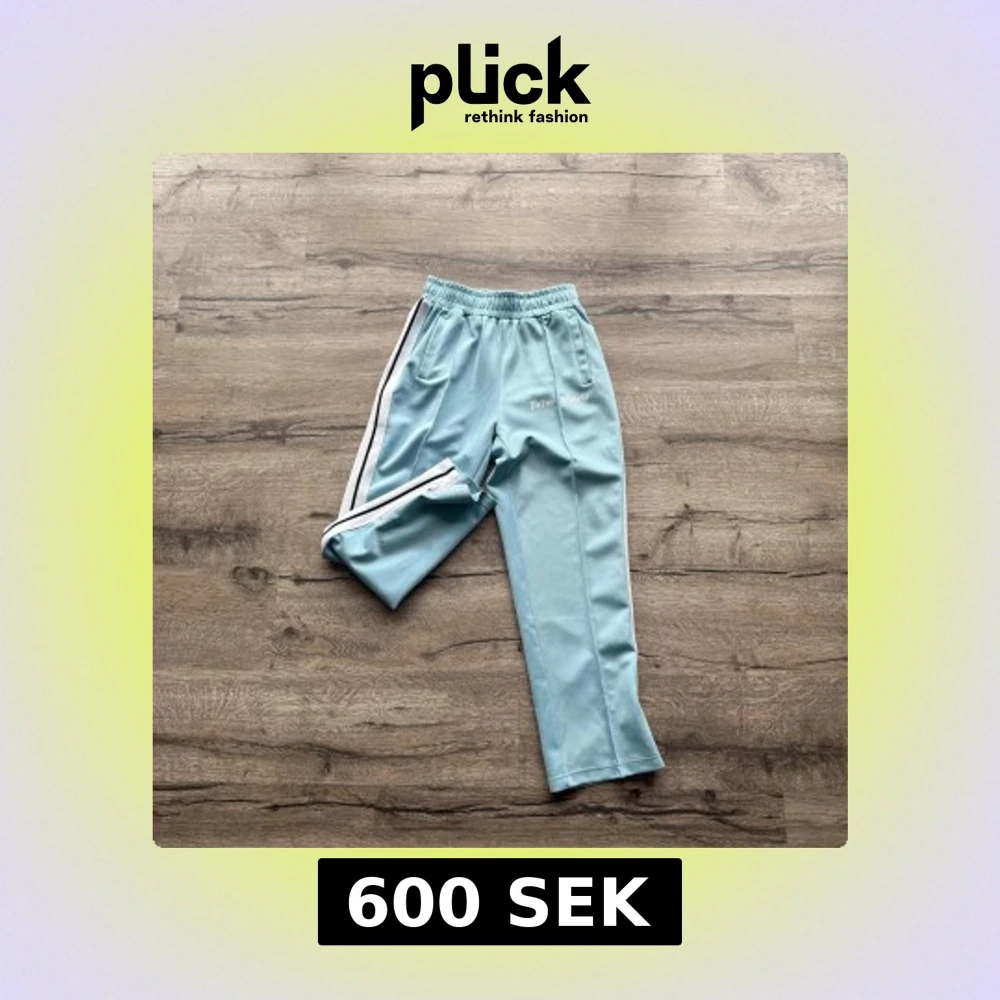 Säljer ett par ljusblå träningsbyxor från Palm Angels med vita sidoränder och dragkedjor vid bensluten. Byxorna har resår i midjan och logga tryckt på framsidan. Perfekta för en sportig look. Nästan helt nya endast använda ett par gånger. Skicka pm vid minsta fundering