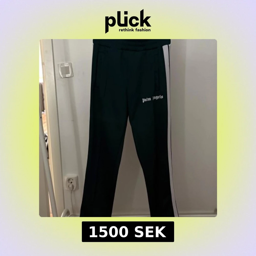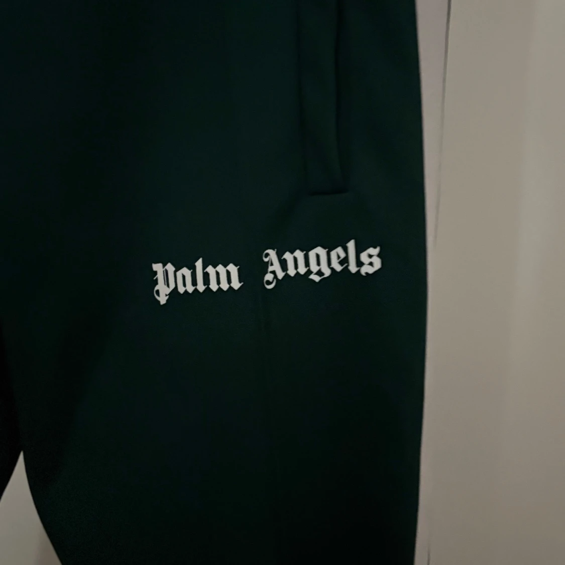 ÄKTA Svarta trackpants från Palm Angels med vit sidoremsa och logga tryckt på låret. Byxorna har elastisk midja och raka ben, perfekt för en sportig och trendig look. Snygga fickor på sidorna och klassisk streetwear-vibe. PRIS KAN DISKUTERAS