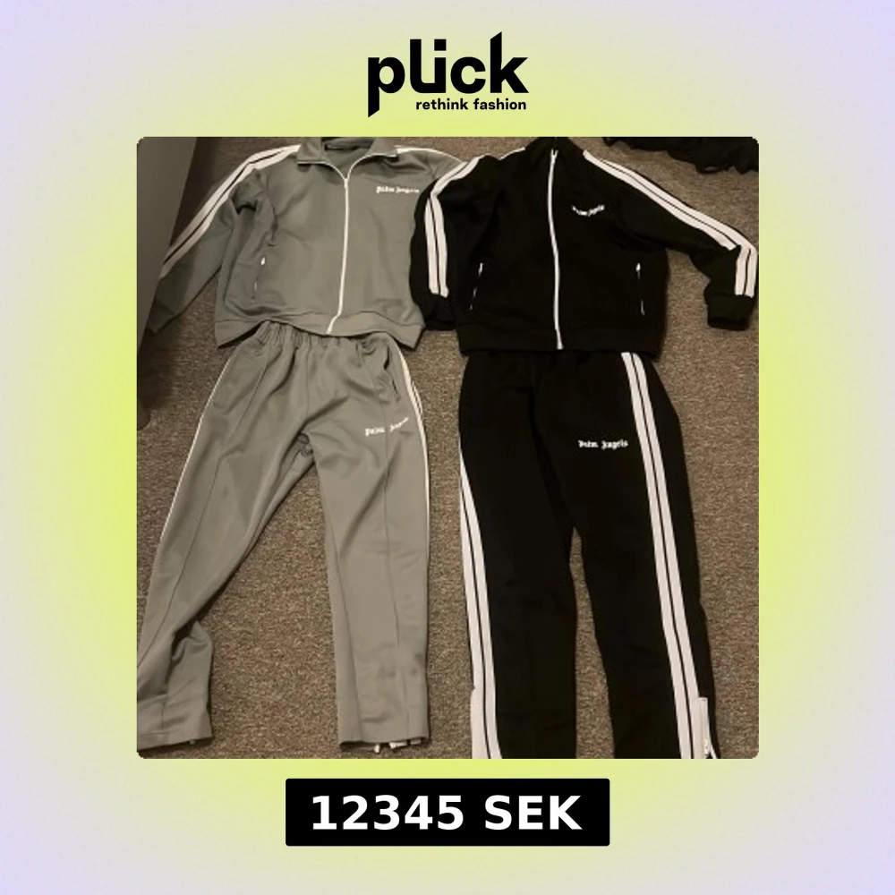 Säljer två par Palm Angels träningsbyxor, ett par i grått och ett par i svart, båda med vita sidoremsor och logga på låret. Byxorna har elastisk midja, raka ben och dragkedja vid benslut. Perfekta för en sportig och trendig look. ”Gröna settet är i storlek L” och den svarta ”M” men kan sitta som s också. Kom med bud