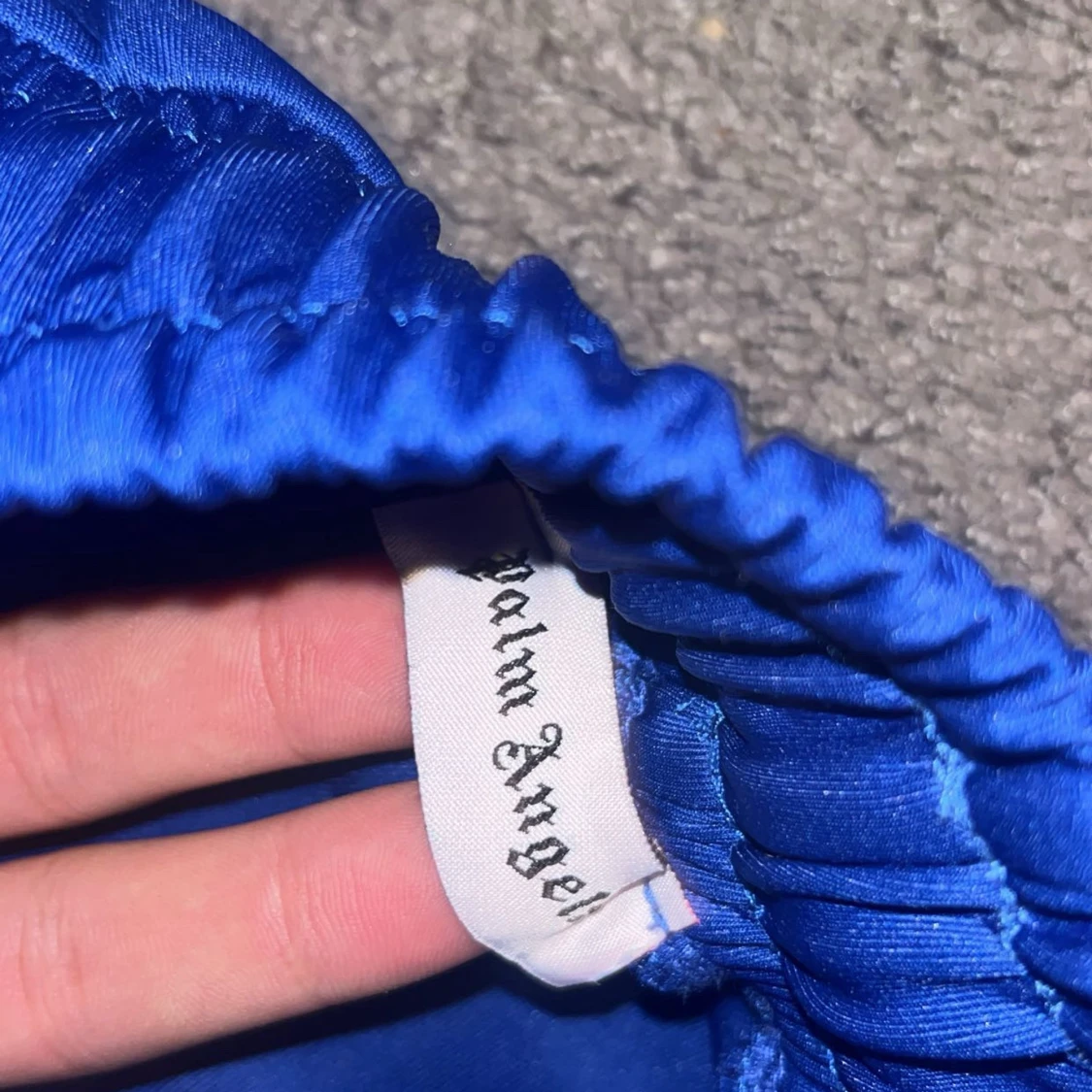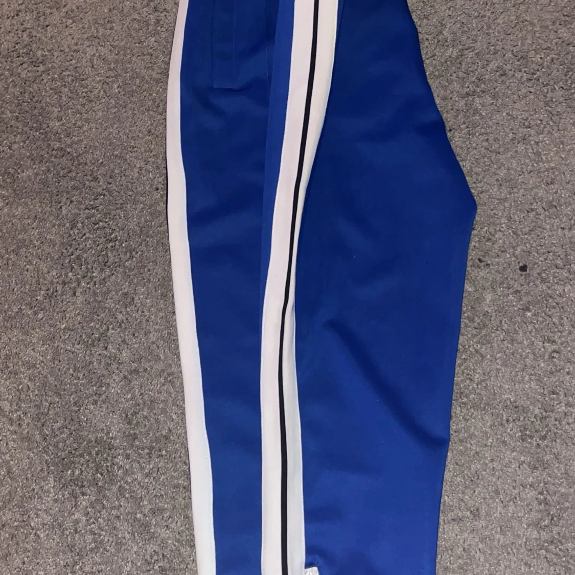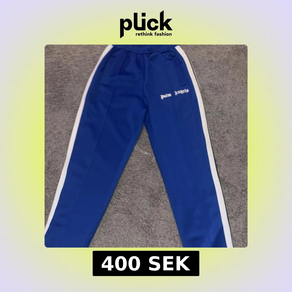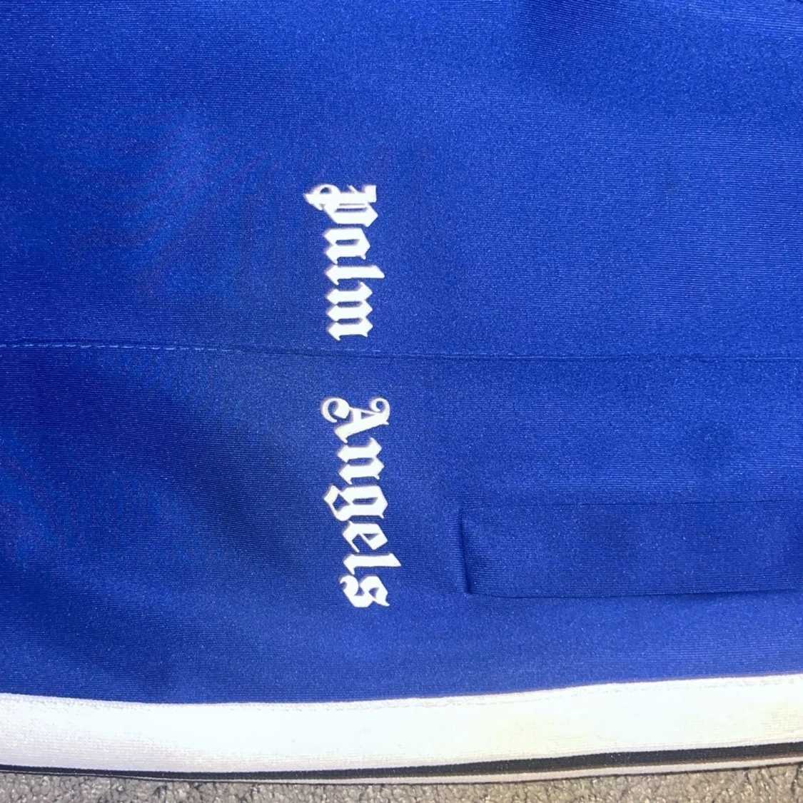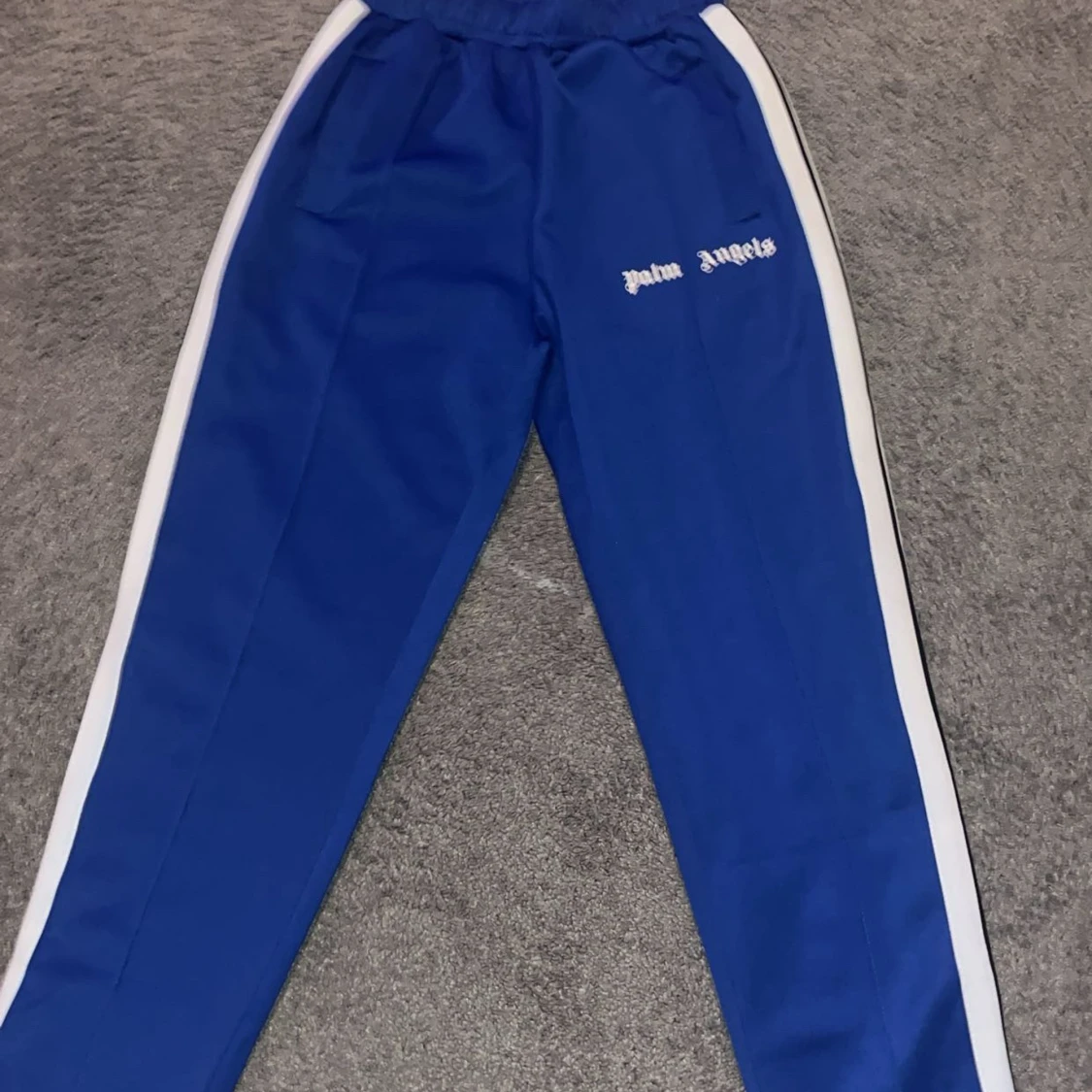 Snygga blå trackpants från Palm Angels med vita sidoränder och logga broderad på vänster ben. Byxorna har elastisk midja och raka ben, tillverkade i glansig polyester för en sportig vibe. Perfekta för en streetwear-look.
