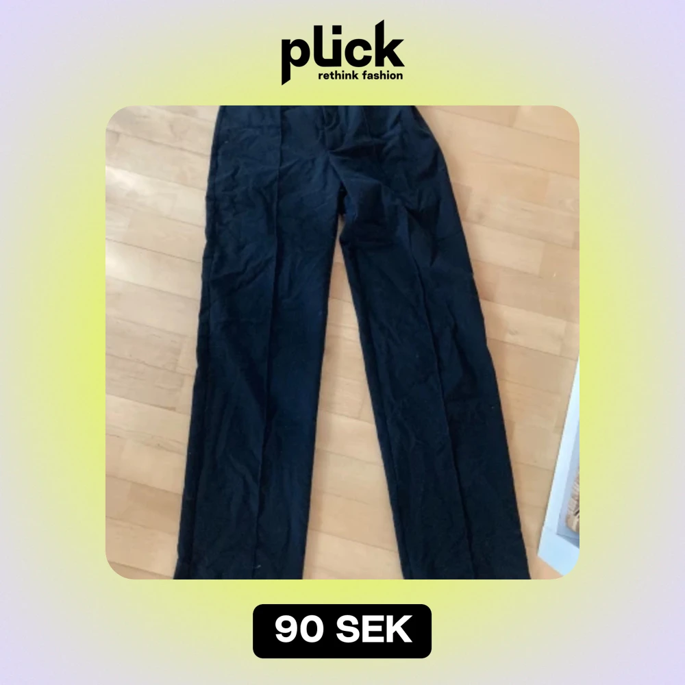 Högmidjade kostymbyxor, passade mig bra i längden som är 175 cm. Smal i midjan men sjukt snygga basic byxor🖤 Frakt tillkommer