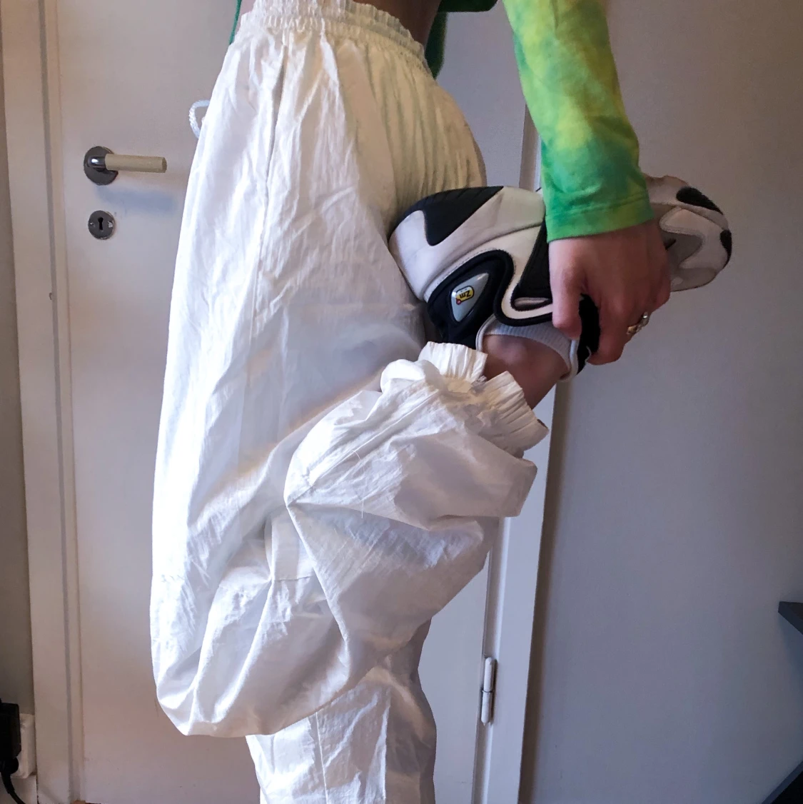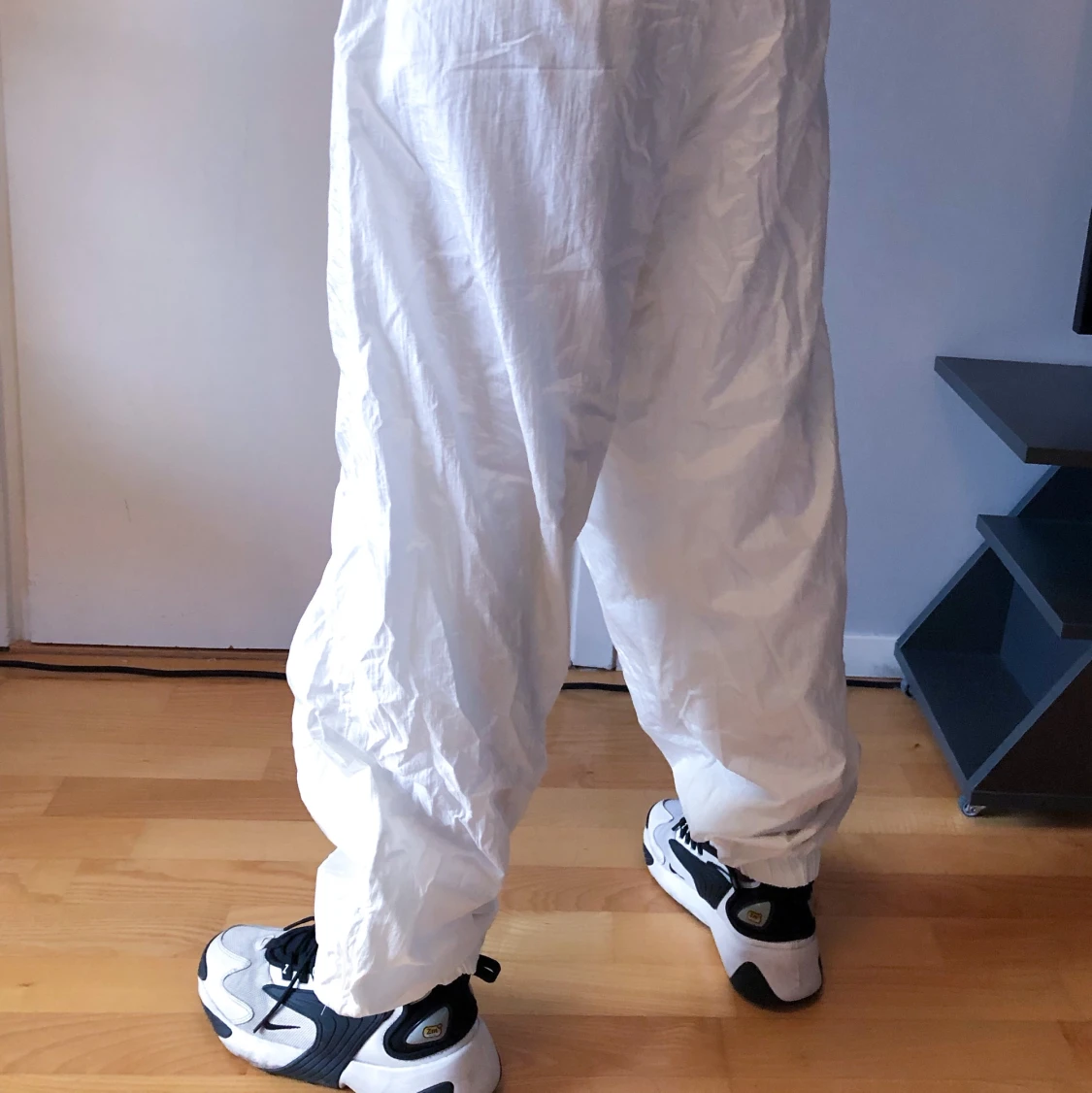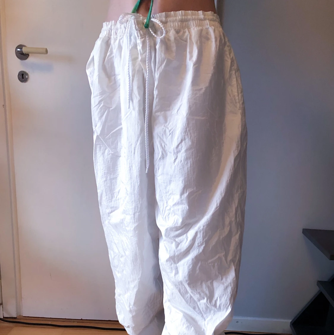 Parachute pants/ fallskärmsbyxor/ träningbrallor i vit lite glansigt material! - varma - använda - Snörning i midjan