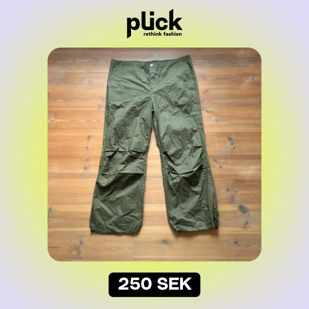 Fallskärmsbyxor i khakifärgat bomullstyg, sitter lågmidjat och går att justera i midjan!