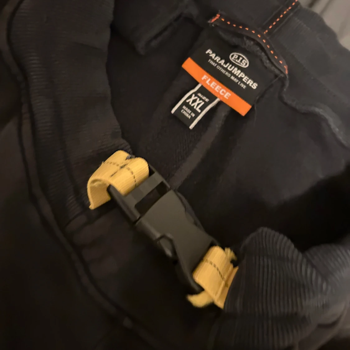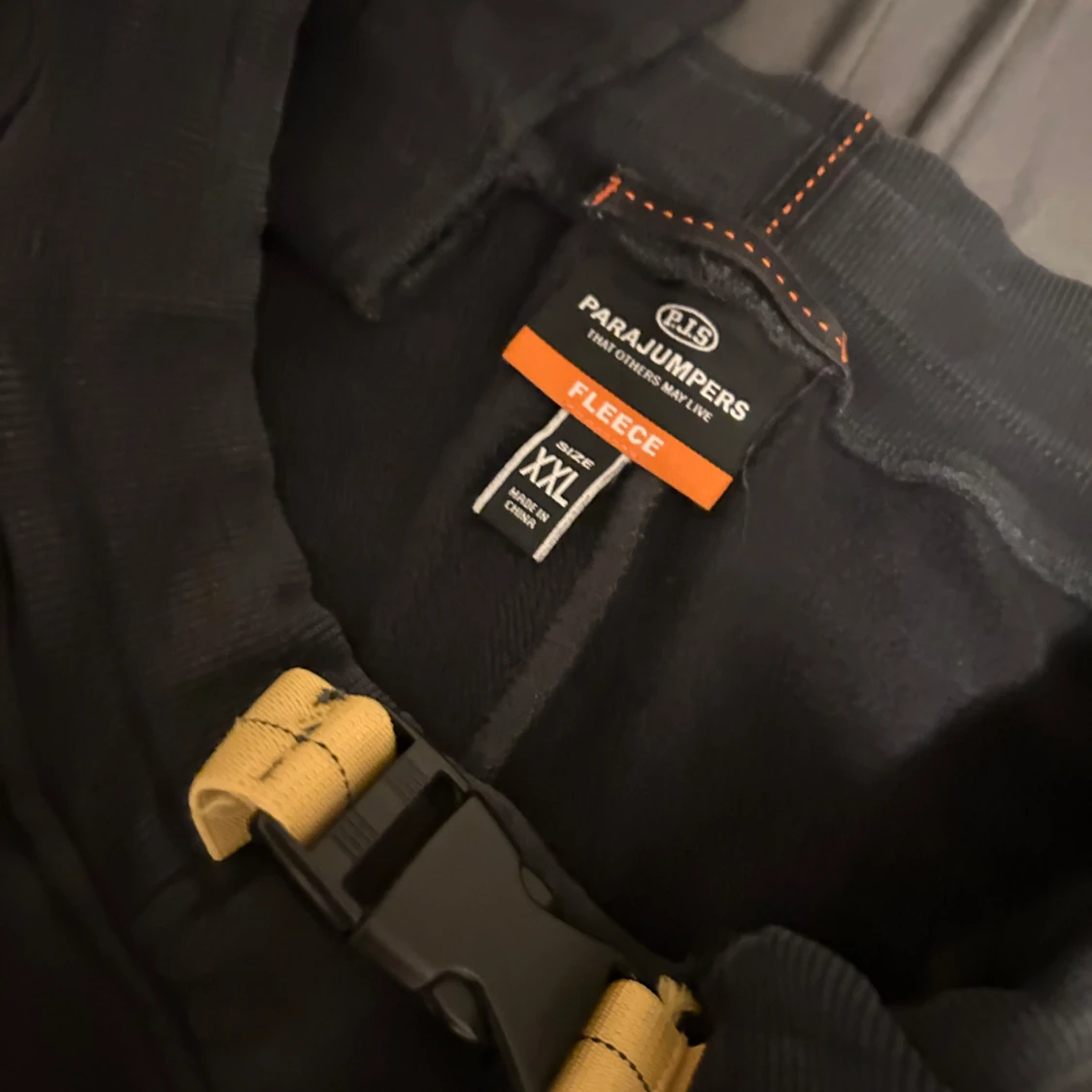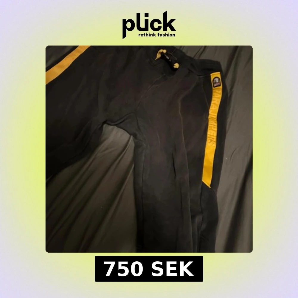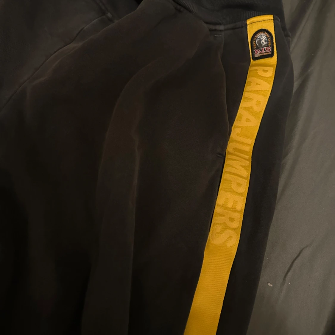 Svarta fleecebyxor från Parajumpers i storlek XXL. Byxorna har en gul sidoremsa med Parajumpers-logga och coolt spänne i midjan. Perfekta för chill eller när du vill ha något riktigt bekvämt och snyggt på dig. Färgen är urtvättat!