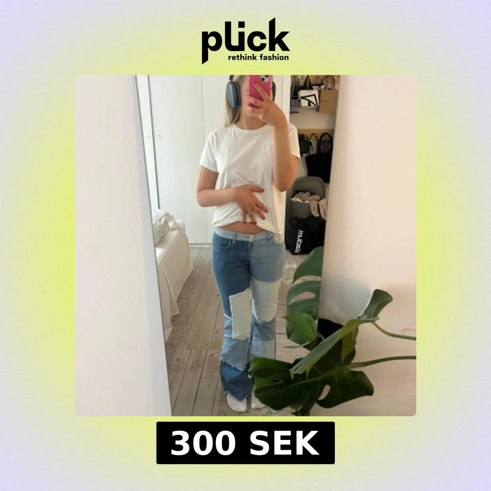 Snygga patchade jeans med olika blå nyanser. De är lågmidjade och bootcut.