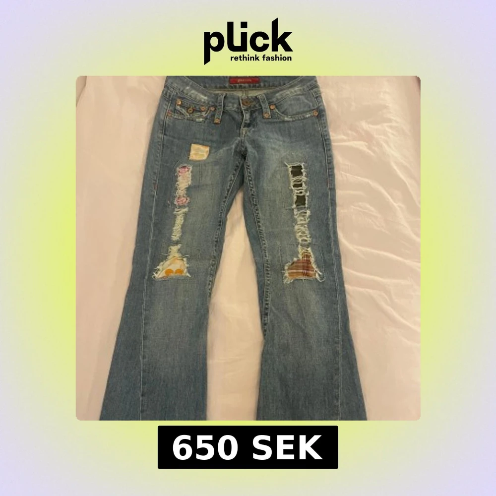 Unika blå jeans med coola slitningar och färgglada patchwork-detaljer. De har en klassisk femficksdesign och knappar fram. Bakfickorna har snygga broderier som ger extra stil. Perfekta för en avslappnad look med en twist. De är väldigt lågmidjade och de e bootcut. Midjemått 38 innerbenslängd 72
