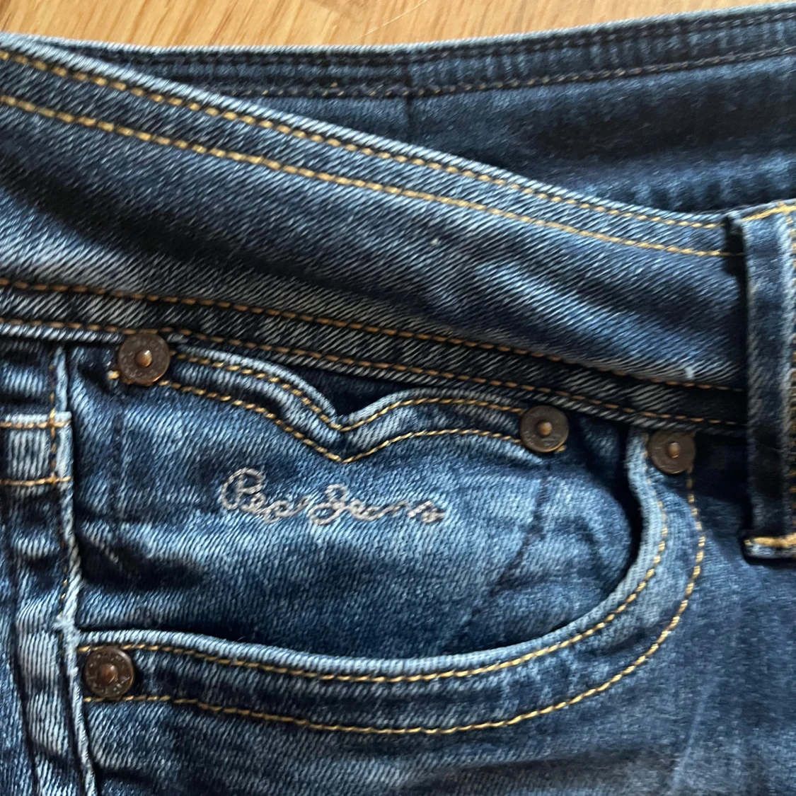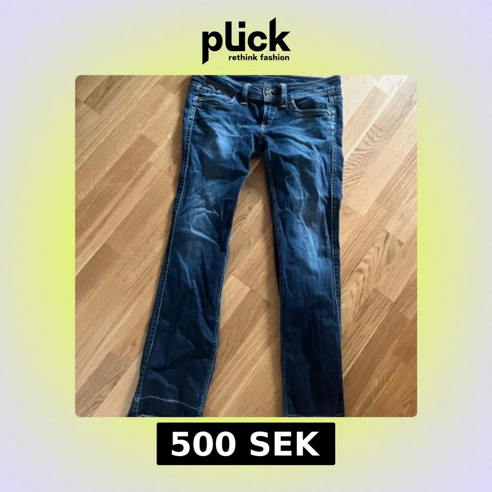 Säljer ett par klassiska blå jeans från Pepe Jeans med snygga slitningar och kontrastsömmar. Modellen har bootcut nedtill och normal passform, med broderad logga på bakfickan. Tillverkade i bomull med lite stretch för extra komfort.