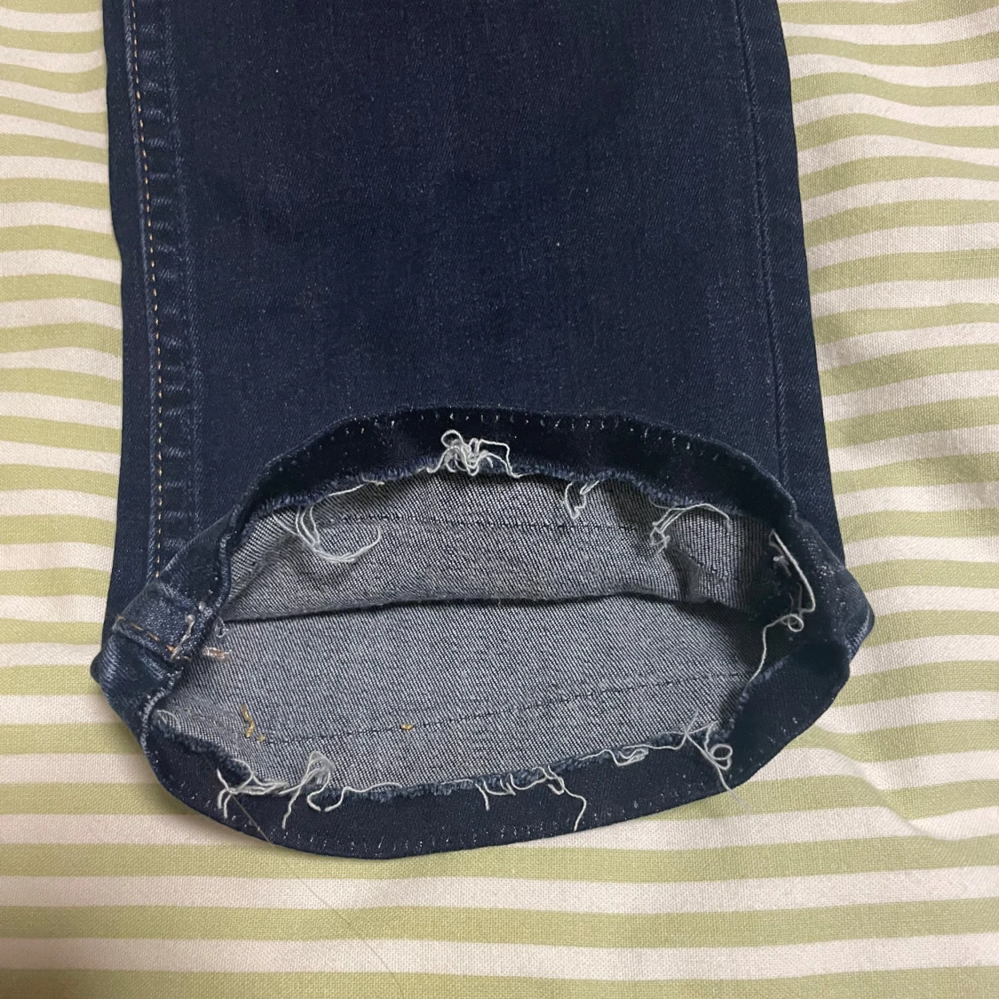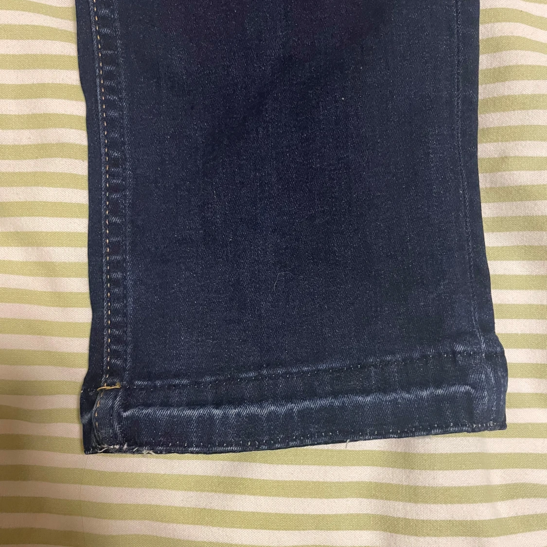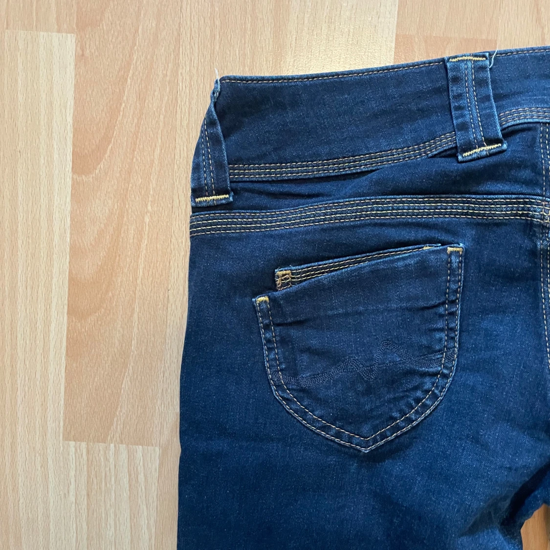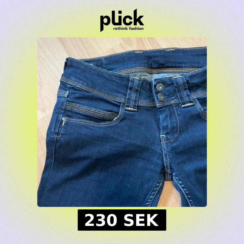 Snygga mörkblå jeans som är lågmidjade och har en rak passform. Köpta på Sellpy Storlek 29/30 Midjemått 78cm, innerbenslängd 75cm Bra skick Sömmen längst ner har tagits upp för att göra dem längre så innebenslängen stämmer ej med de extra cm