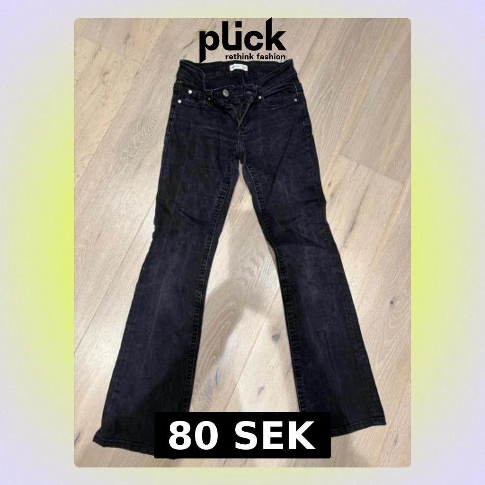 Svarta jeans från Gina Tricot med bootcut-snitt och klassisk femficksdesign. Byxorna är i skön stretch, normal midja, dragkedja och knapp framtill. Materialet är jeans med en lätt tvättad look.
