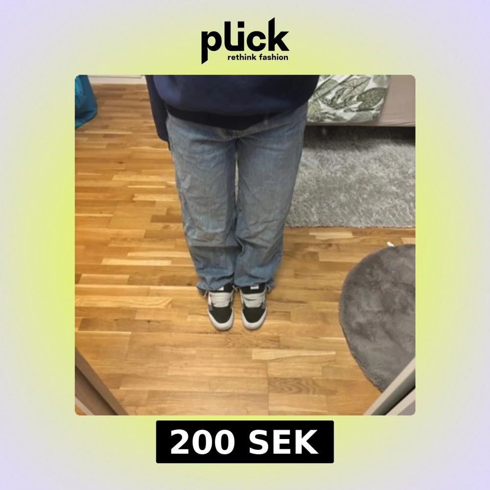 Säljer ett par ljusblå jeans från Gina Tricot i storlek 32. De har en loose fit med raka ben och klassisk femficksdesign. Jeansen är tillverkade i bomull och har en snygg tvättad look med kontrastsömmar.