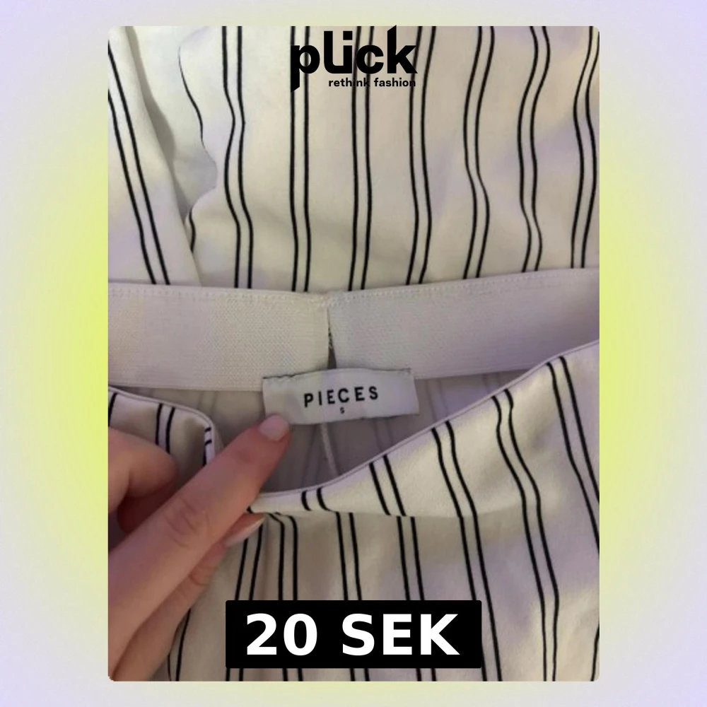 Säljer ett par vita byxor från Pieces i storlek S med tunna svarta vertikala ränder. Byxorna har en rak passform och elastisk midja för extra komfort. Perfekta för dig som gillar en clean och stilren look.