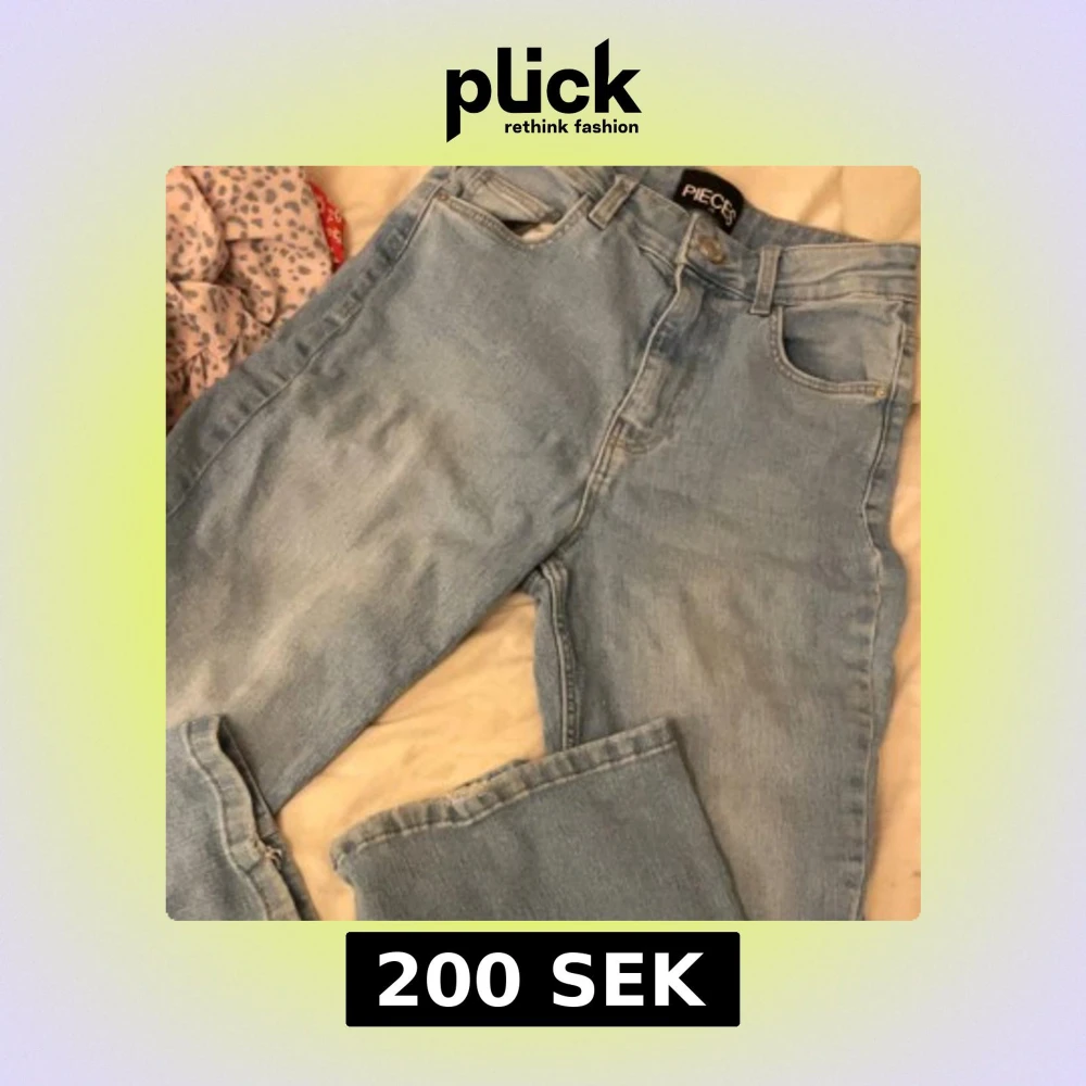 Säljer ett par ljusblå jeans från Pieces med klassisk femficksdesign och utsvängda ben. Jeansen har hög midja och är tillverkade i mjukt denimtyg. Perfekta för en avslappnad och trendig look. Storlek S