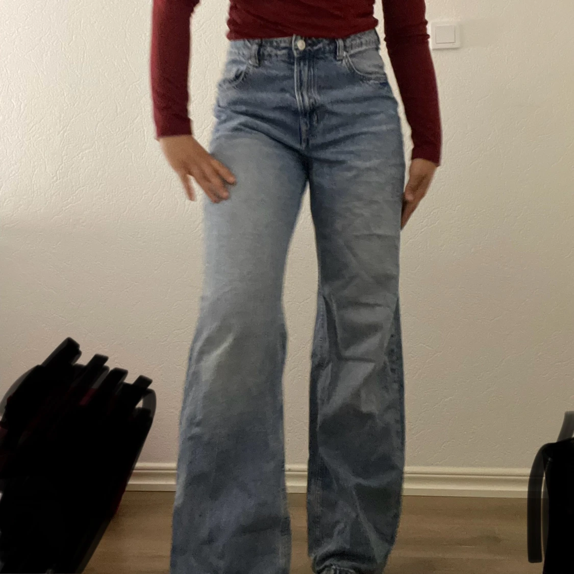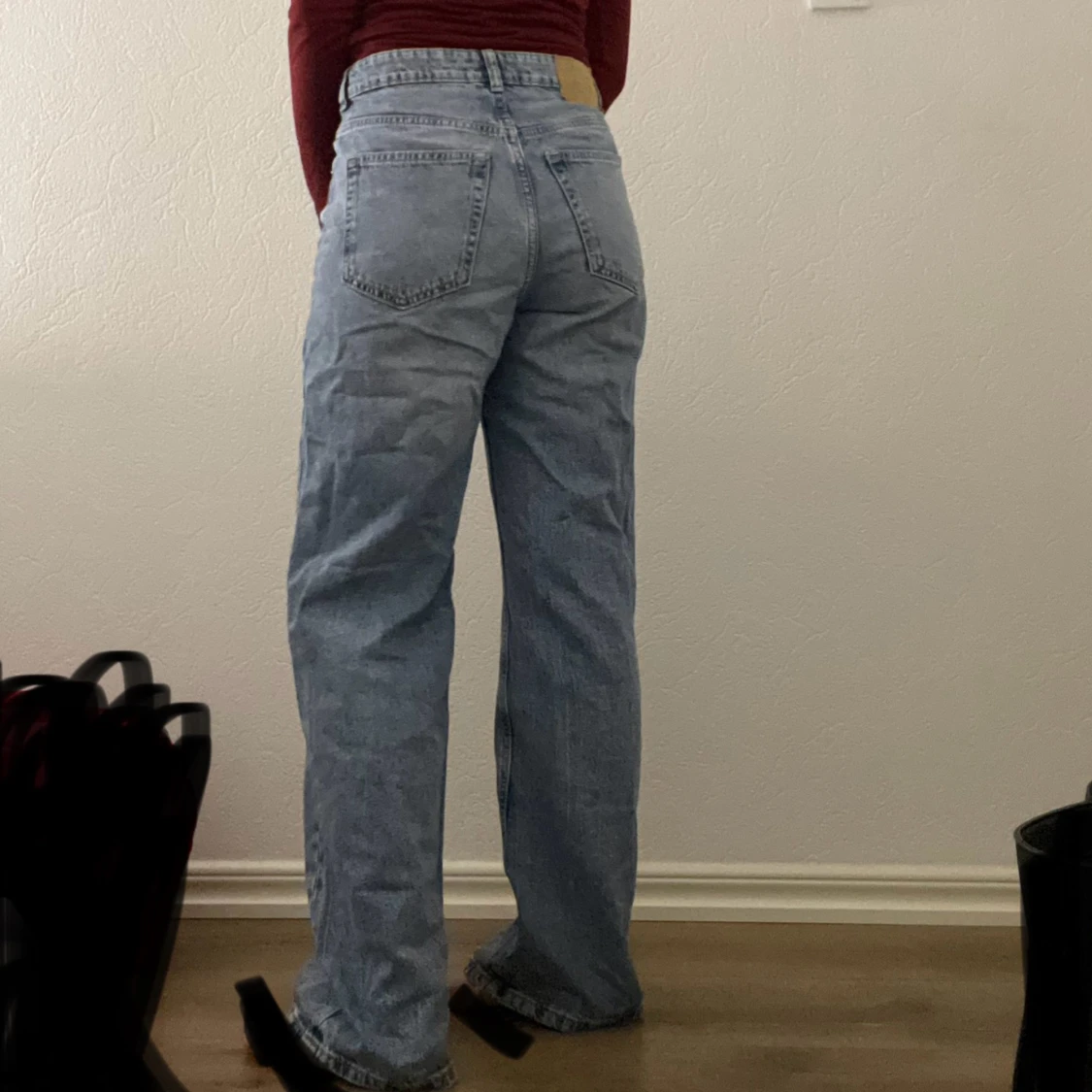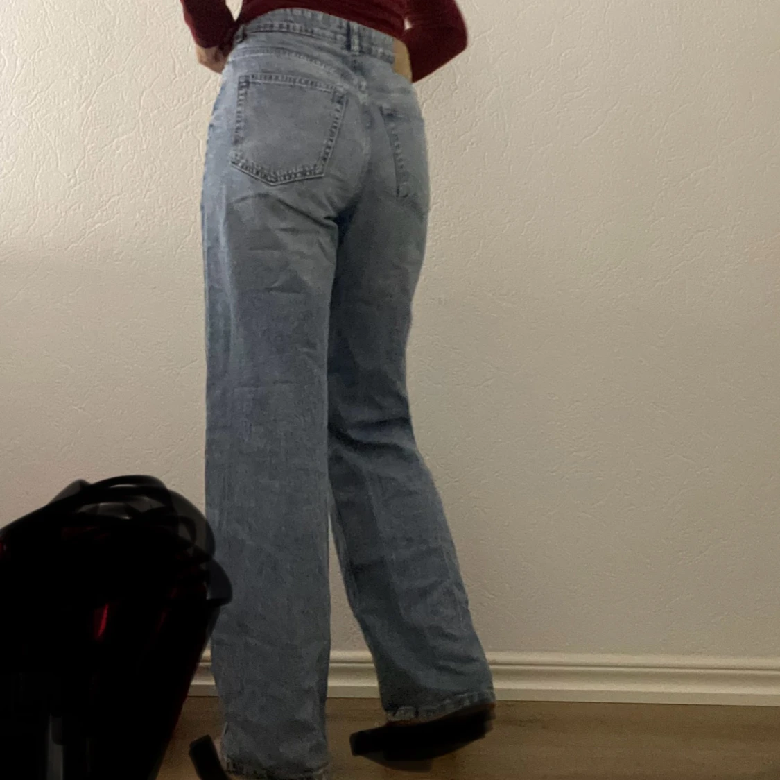 Snygga blå jeans från H&M med en klassisk straight fit. De är högmidjade. Jeansen har en knapp och dragkedja framtill samt fickor både fram och bak. De är i storlek 38 (OBS! Den är lite sönder nere "bild finns i annonsen" men inget som märks, man behöver stryka den lite eftersom den inte har varit använd på ett tag) EJ RETUR!! 💕