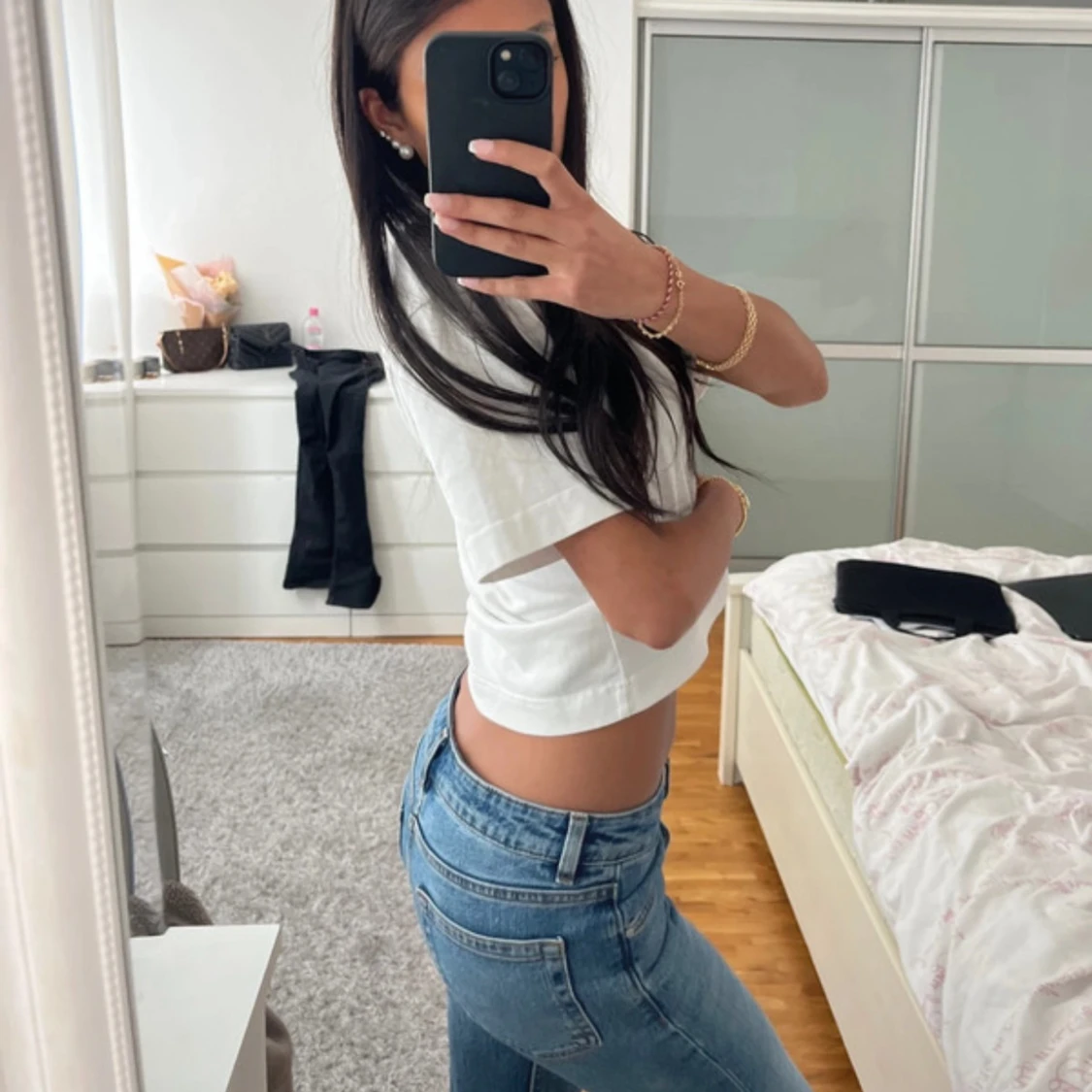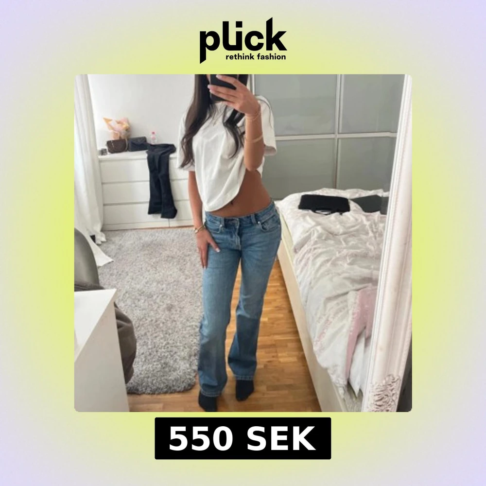 Säljer ett par klassiska blå jeans med bootcut-snitt och låg midja. Jeansen har en tidlös tvätt och raka ben som blir lite vidare nertill. Perfekta för dig som gillar en avslappnad och trendig look. Materialet är jeans i bomull. Längd 32 Waist 24