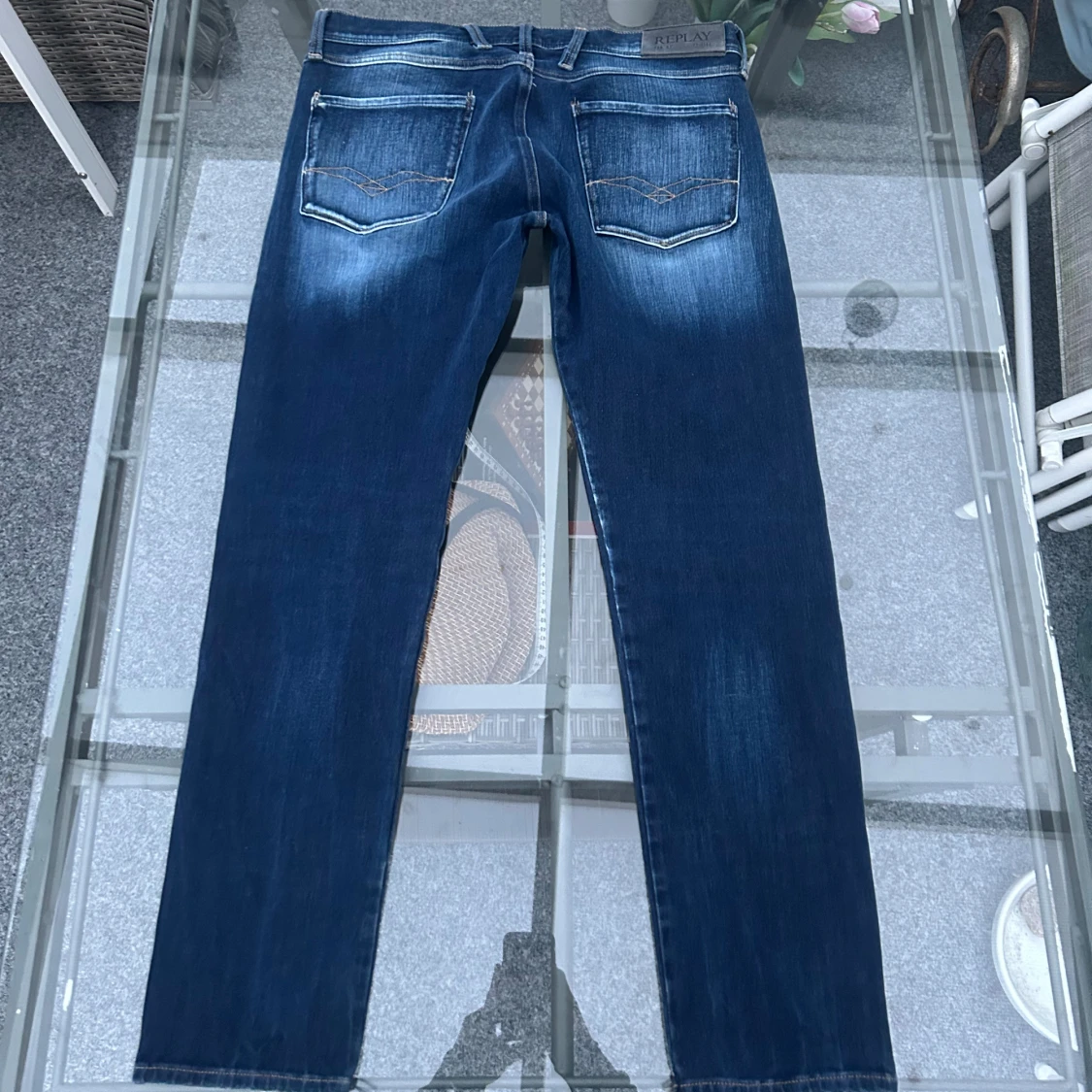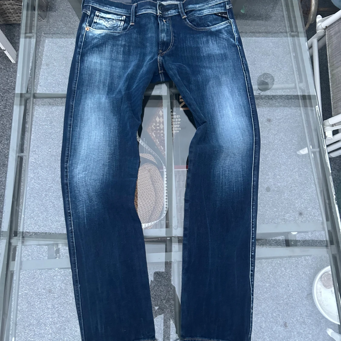 Snygga och klassiska jeans från Replay, modell ANBASS i storlek 32. Slim fit med lätt stretch för perfekt passform och komfort. Mörkblå tvätt med snygga slitningar som ger en exklusiv, använd look. Kvaliteten är riktigt bra – jeansen är i fint skick utan hål eller fläckar. Perfekta för både vardag och kväll, matchas lika bra med sneakers som med skjorta. 👖 Modell: Replay Anbass 📏 Storlek: 32 🎨 Färg: Mörkblå / tvättad denim 💎 Skick: Mycket bra 💰 Nypris ca 1500–1800 kr