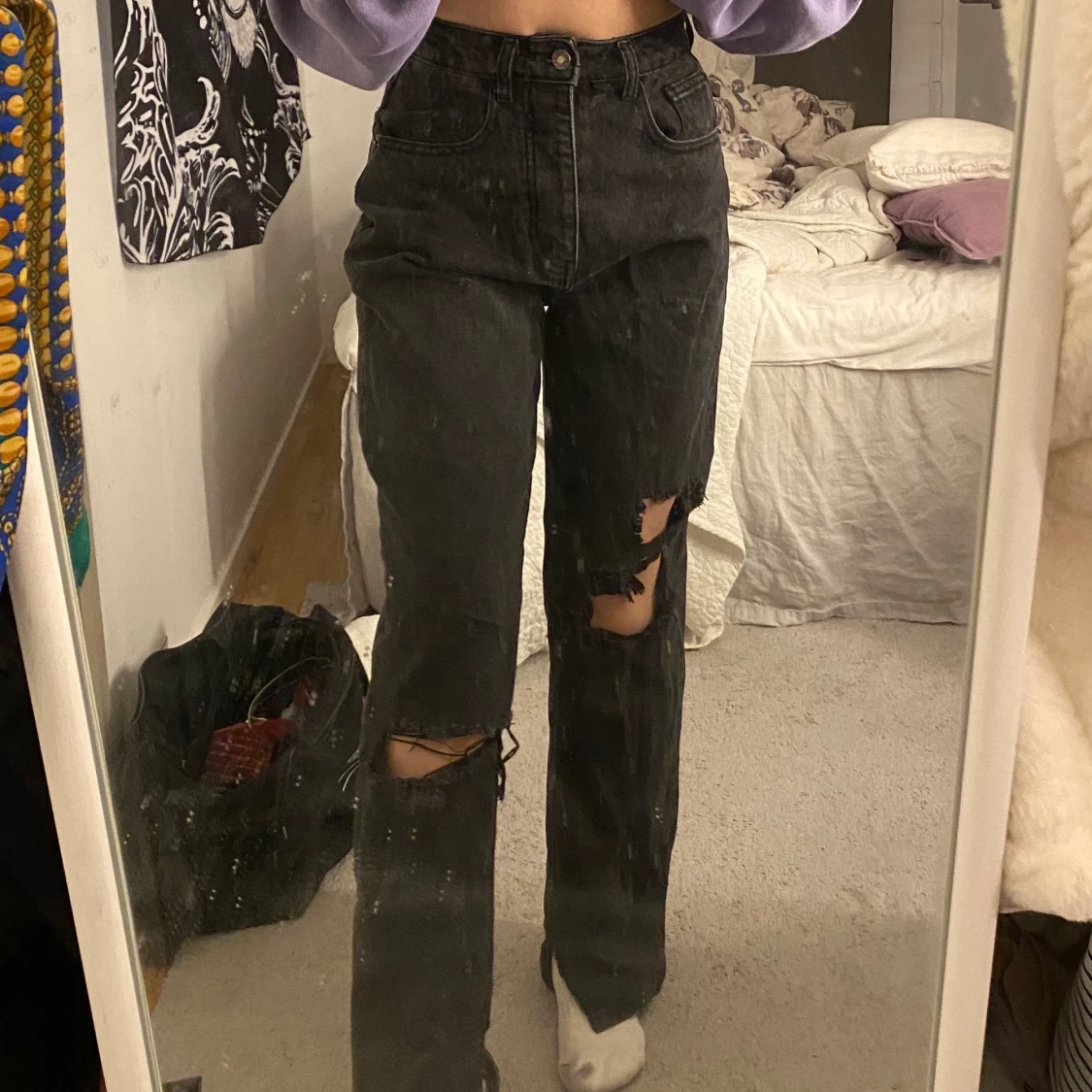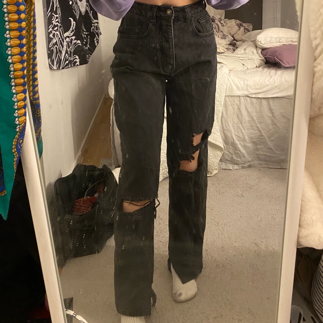 Så najs svarta baggy jeans med slitningar, de är köpta från pretty little thing förra året men använder dem aldrig så säljer därför vidare! Jag är 159 cm och de är en bra längd på mig, skulle också passa om man är lite längre!