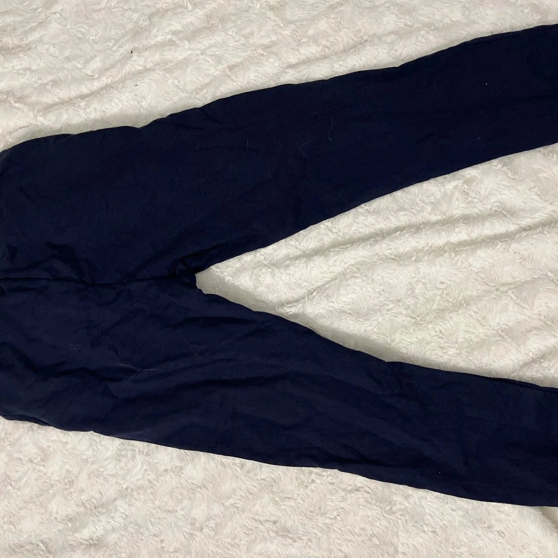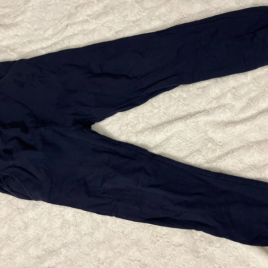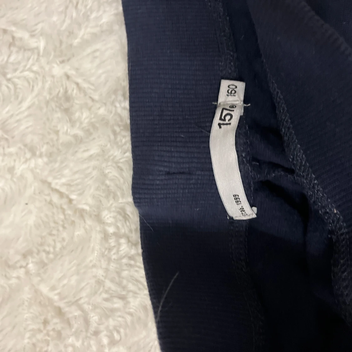 Säljer ett par marinblå byxor i storlek 160. De är i bra skick och perfekta för vardagsbruk. Byxorna har en enkel design och är bekväma att bära. Passar till både avslappnade och mer uppklädda tillfällen.