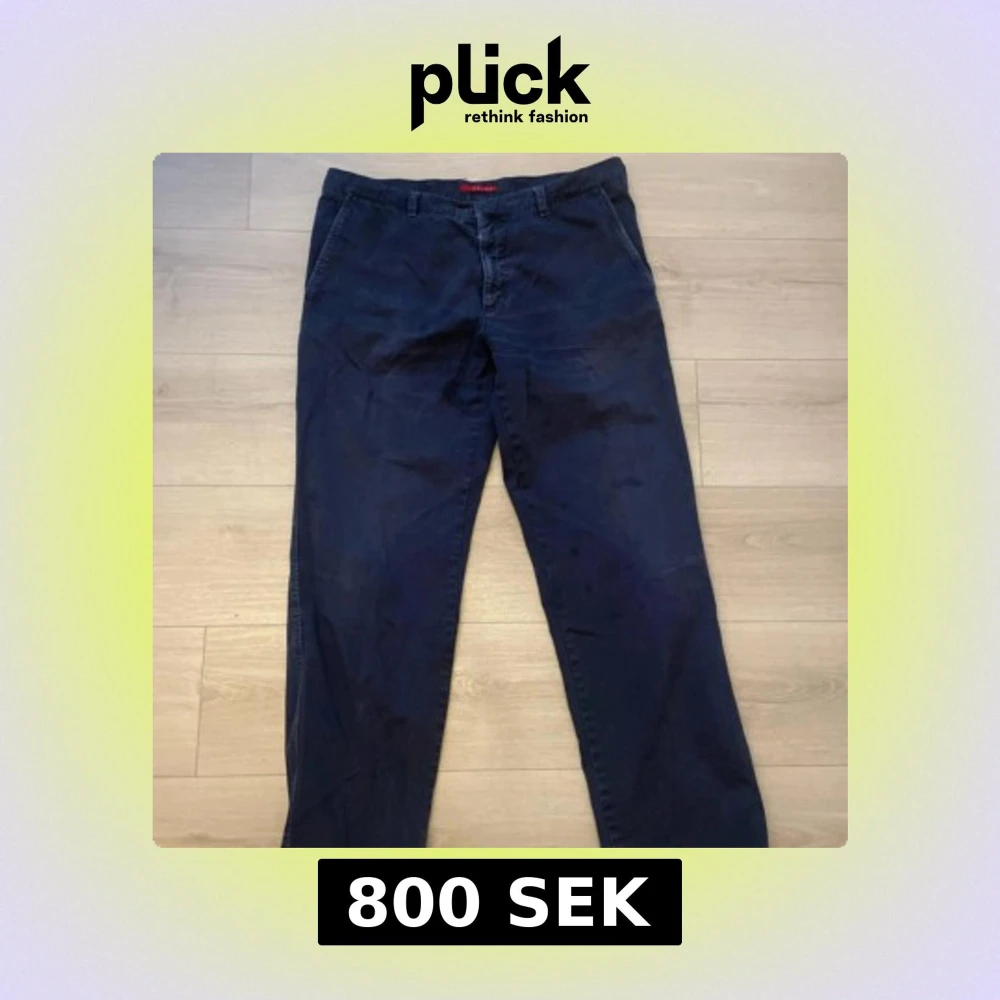 Snygga mörkblå chinos från Prada med klassisk rak passform och diskret röd detalj på insidan av midjan. Byxorna har dragkedja med metallzip där det står Prada Milano. Tillverkade i mjuk bomull med fickor fram och bak.