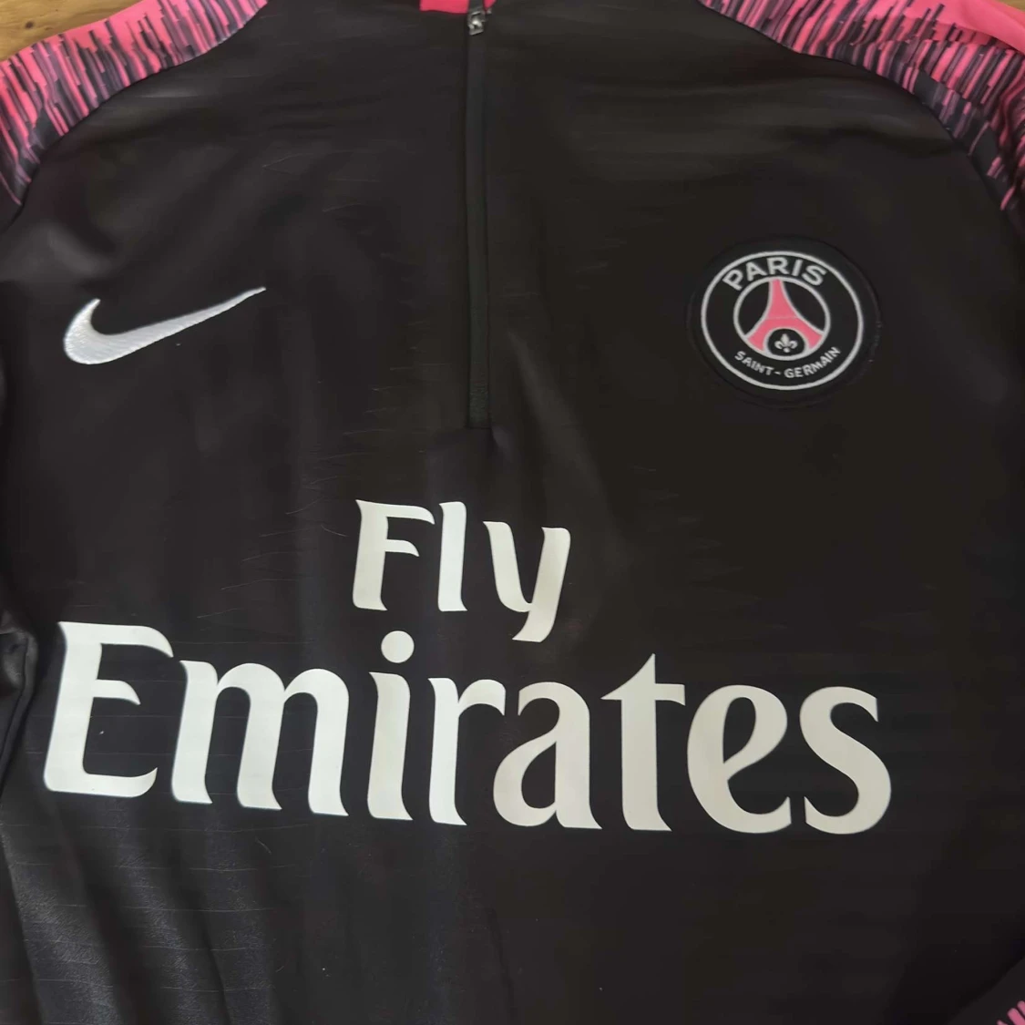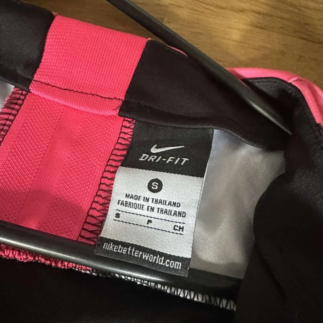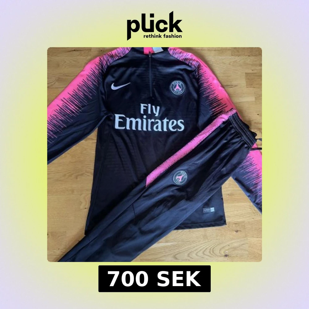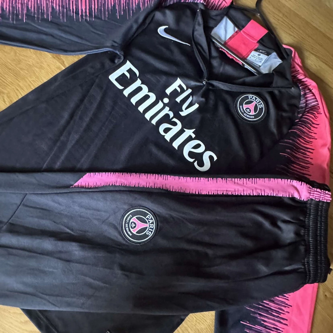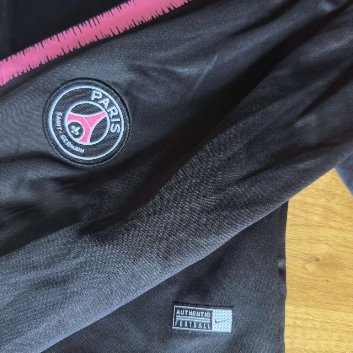 Säljer ett par svarta PSG träningsbyxor från Nike med rosa detaljer längs sidorna och broderad klubbmärke. Byxorna är i sportig Dri-FIT polyester, har elastisk midja med snörning och smal passform. Perfekta för fotbollsträning eller chill.
