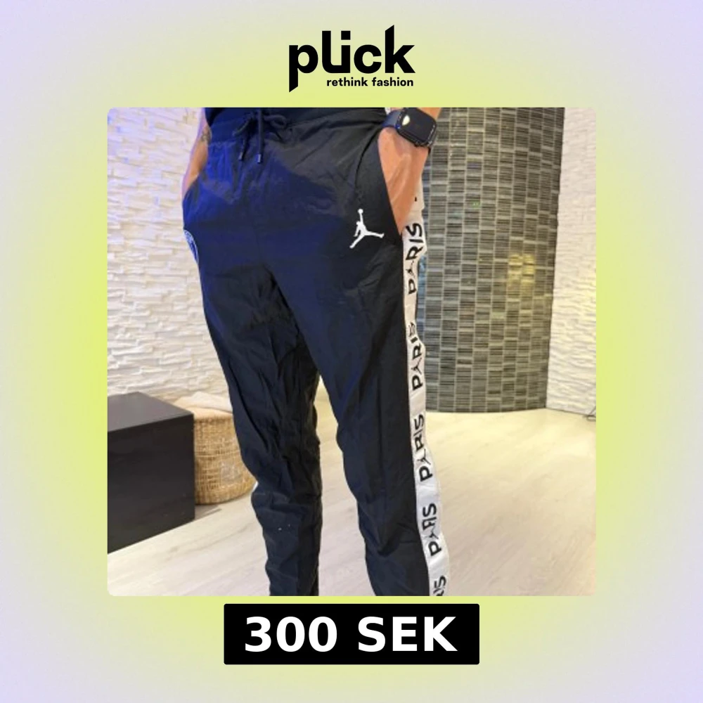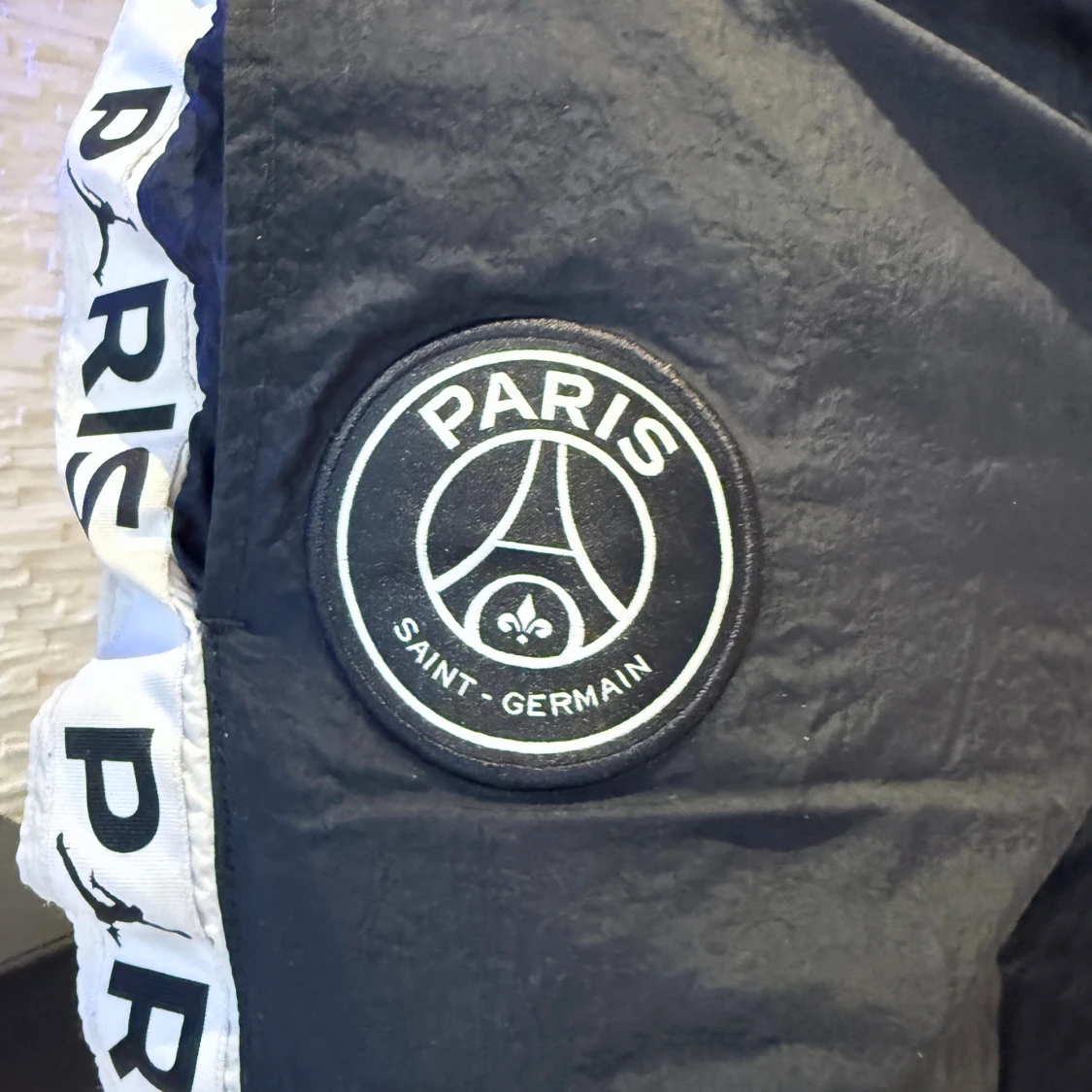 Svarta träningsbyxor från Jordan x PSG med vita sidopaneler där det står 'PARIS' och Jumpman-logga. Byxorna har snörning i midjan, fickor och PSG-märke på låret. Lätta och sportiga, perfekta för en streetwear-look. Passar bra som oversize modell. Original!!!