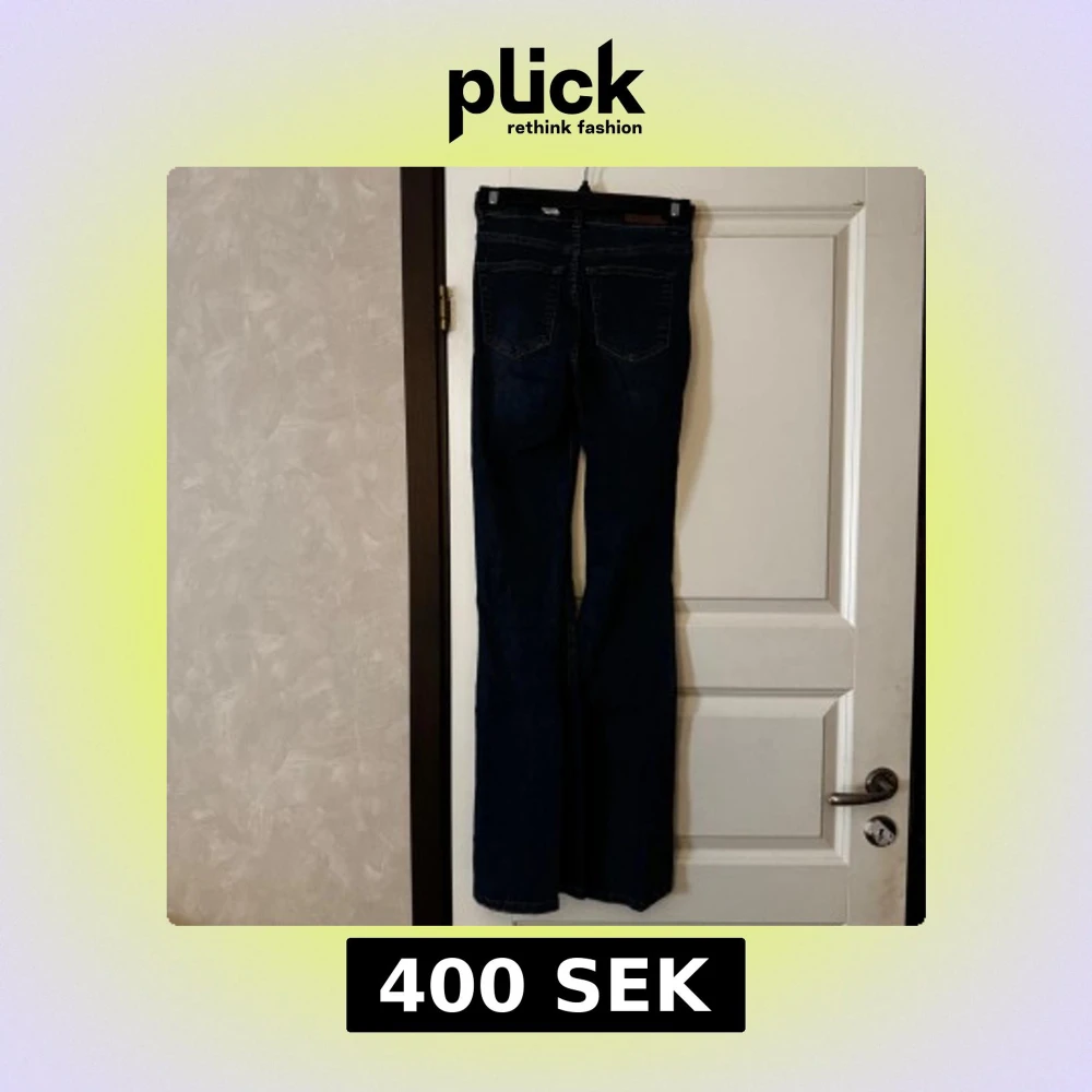 Säljer ett par mörkblå jeans med klassisk bootcut-passform. Jeansen har fem fickor, synliga sömmar och normalhög midja. Perfekta för dig som gillar en tidlös jeansstil.