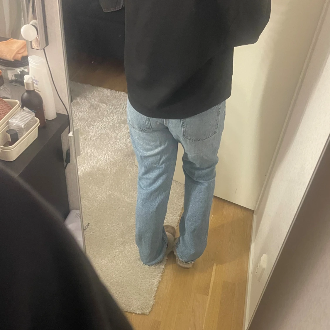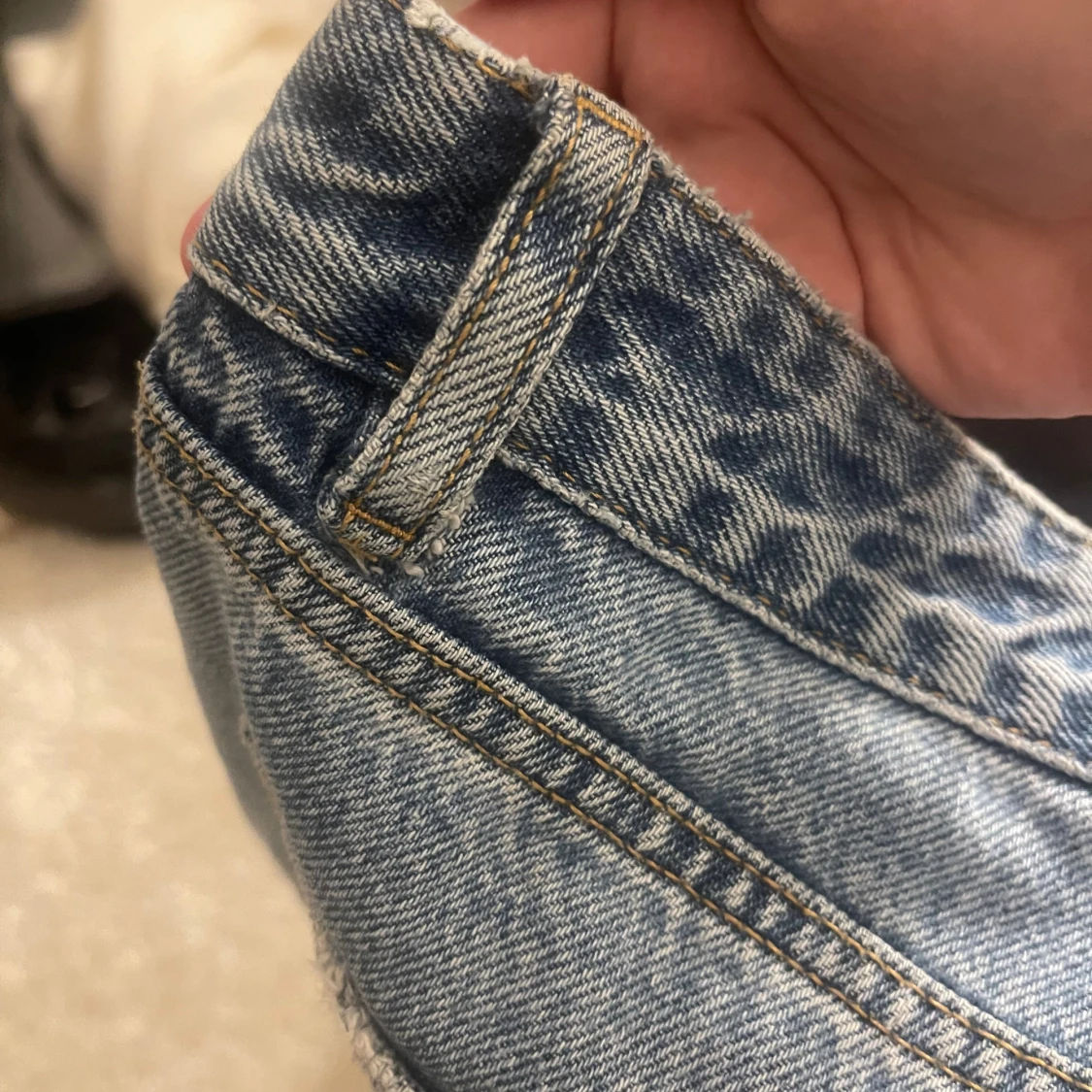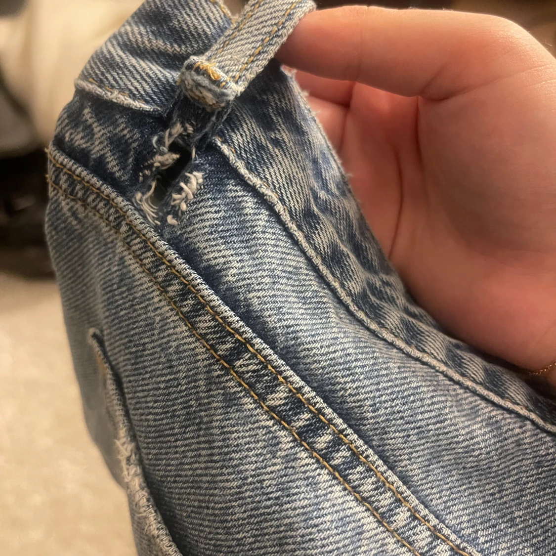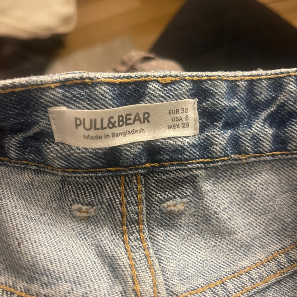 Blåa jeans från pull and bear. Se bild 3, defekt på en bälteshälla. På bild 4 kan man se att de inte syns så mycket och de är nog lätt att sy ihop. Mycket bra skick annars.