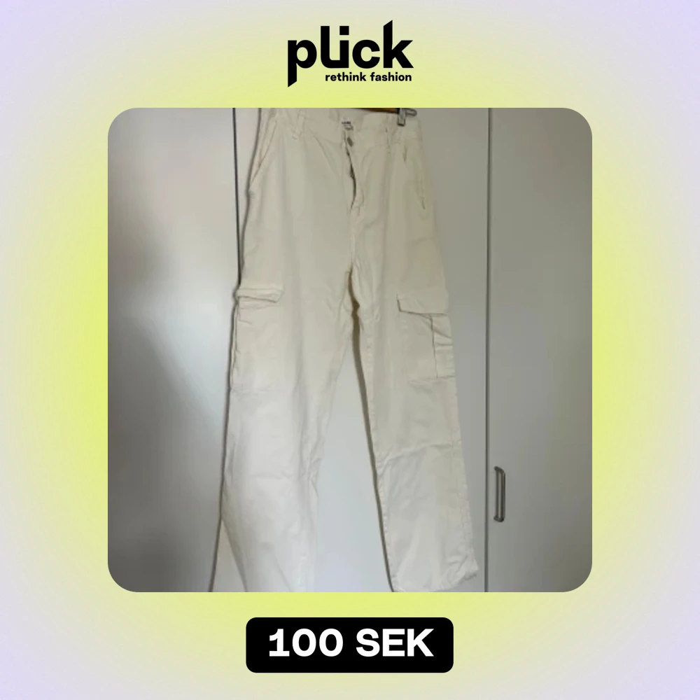 Säljer ett par snygga vita cargobyxor från Pull&Bear. De har en avslappnad passform med praktiska fickor på sidorna. Perfekta för en casual look eller att klä upp. Byxorna är i bra skick och passar S-M beroende på hur man vill att de ska sitta