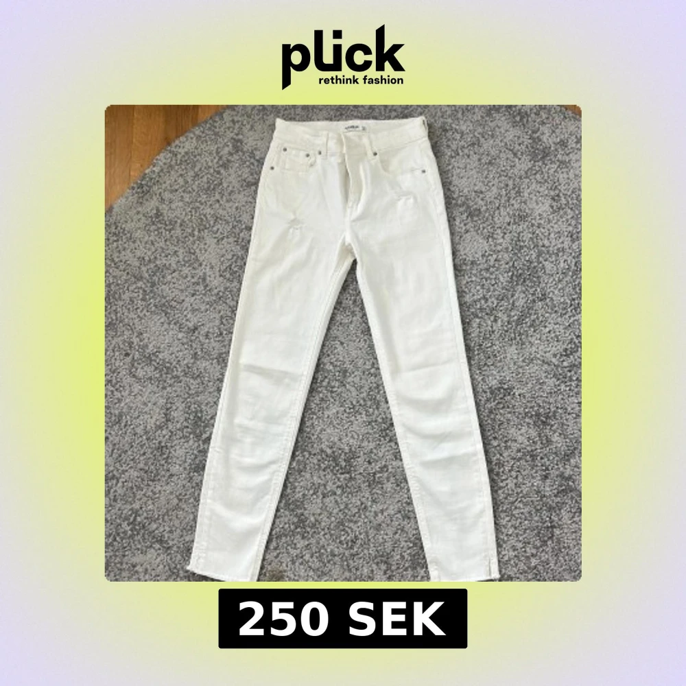 Säljer ett par vita jeansbyxor från Pull&Bear i klassisk femficksmodell. Byxorna har smal passform och låg midja, perfekta till många olika outfits. Stängs med dragkedja och knapp framtill. Perfekta ljusa jeans för sommaren. Säljs pga för liten för mig. ❤️