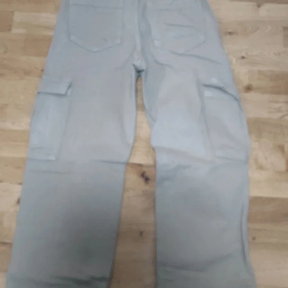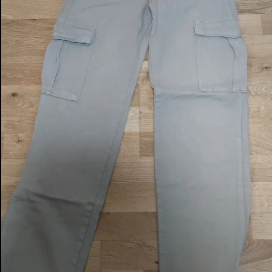Säljer ett par ljusgrå cargobyxor från Pull&Bear med stora fickor på sidorna. Byxorna har en rak passform och är perfekta för en avslappnad stil. Tillverkade i ett mjukt bomullsmaterial. Byxorna sälja även på vinted.