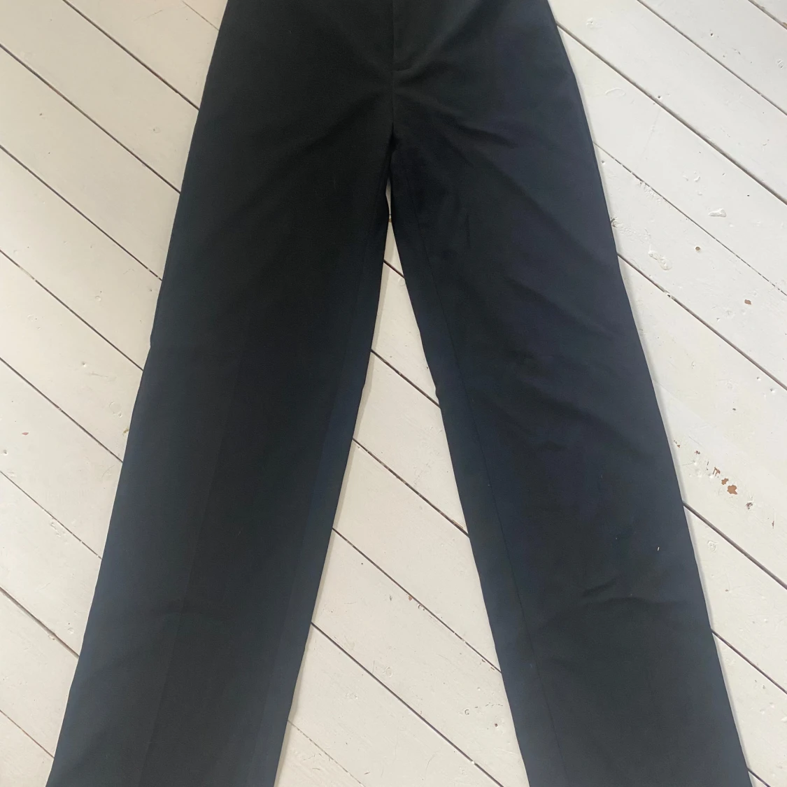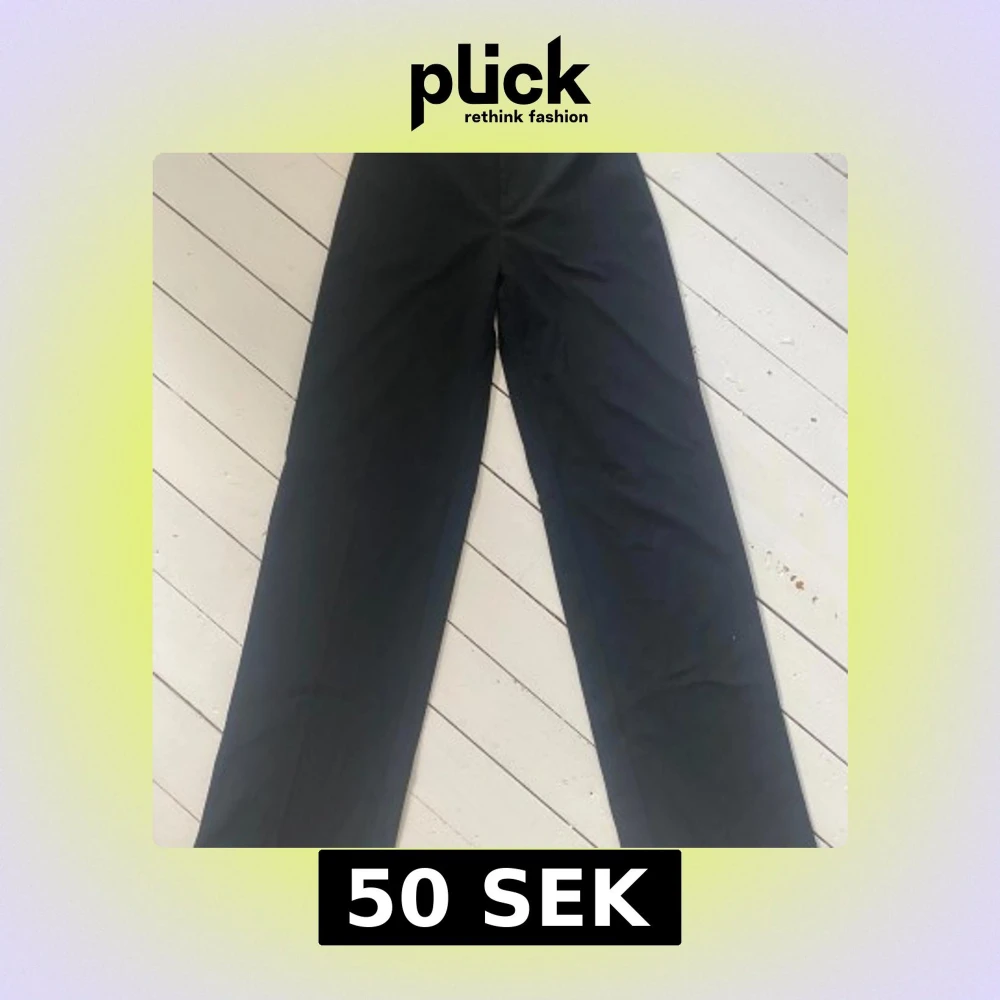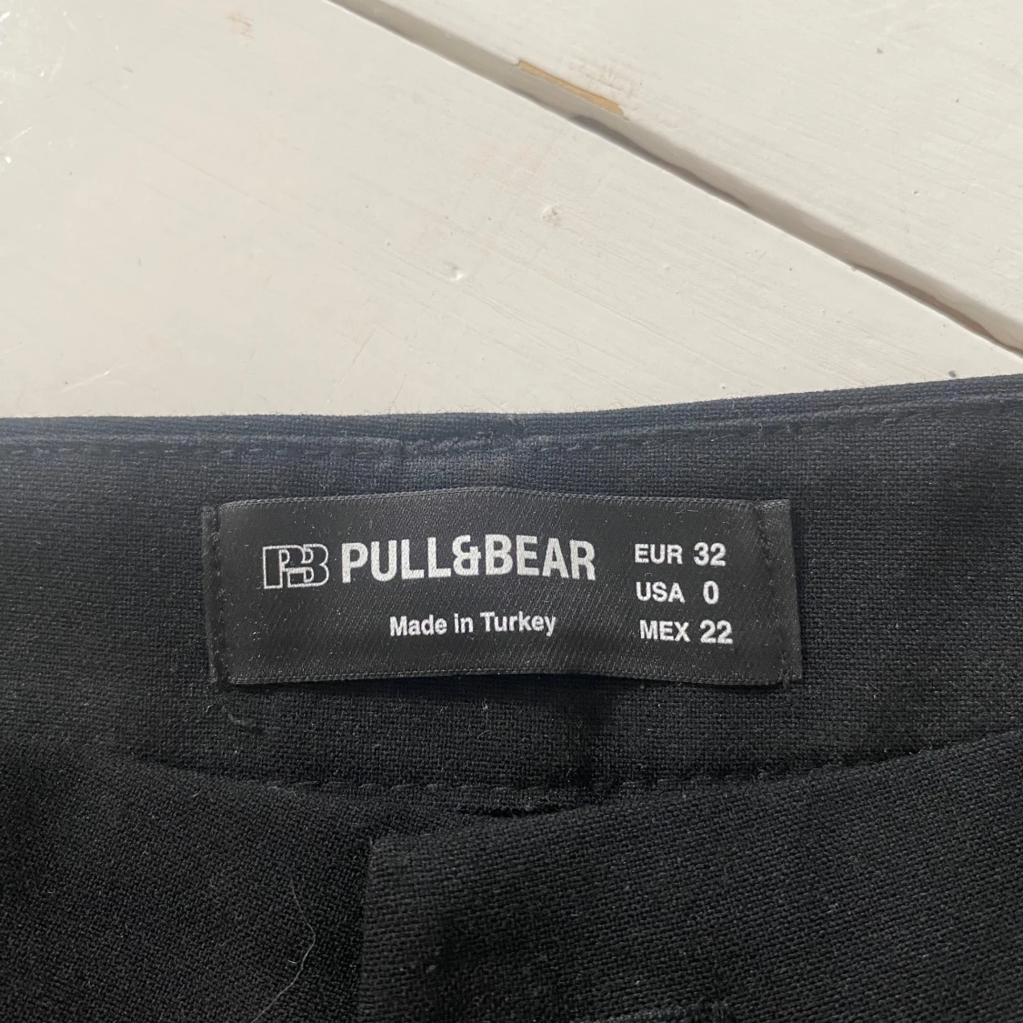 Svarta kostymbyxor från Pull&Bear i klassisk rak modell. Byxorna har hög midja och vida ben för en clean och stilren look. Köpta i spanien storleken är 32 men känns som S skulle jag säga!