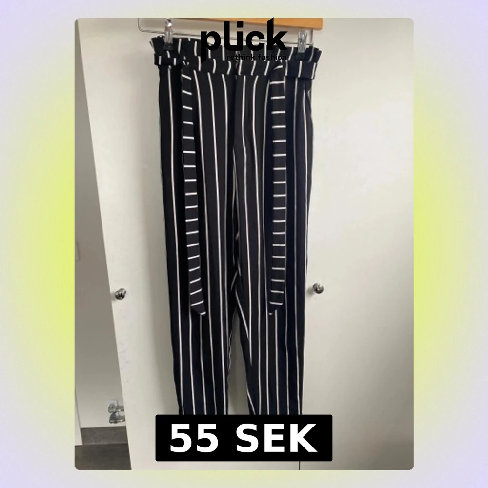 Svarta byxor med vita vertikala ränder och högt papperspåse-midja. Byxorna har ett brett knytband i midjan och raka ben.