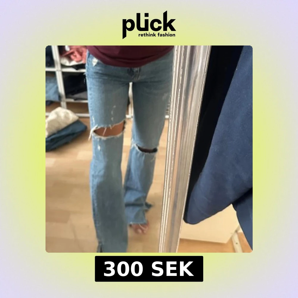 Säljer ett par ljusblå bootcut jeans. Jeansen har klassisk femficksdesign och råa kanter nertill för en avslappnad vibe. Perfekta för dig som gillar en trendig och avslappnad look.