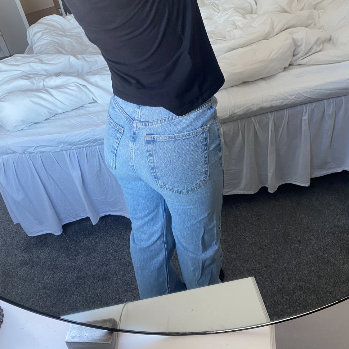Blåa jeans från pull&bear med ett hål på överlåret, fransiga/avklippta längst ner. Jag är 160cm lång💕