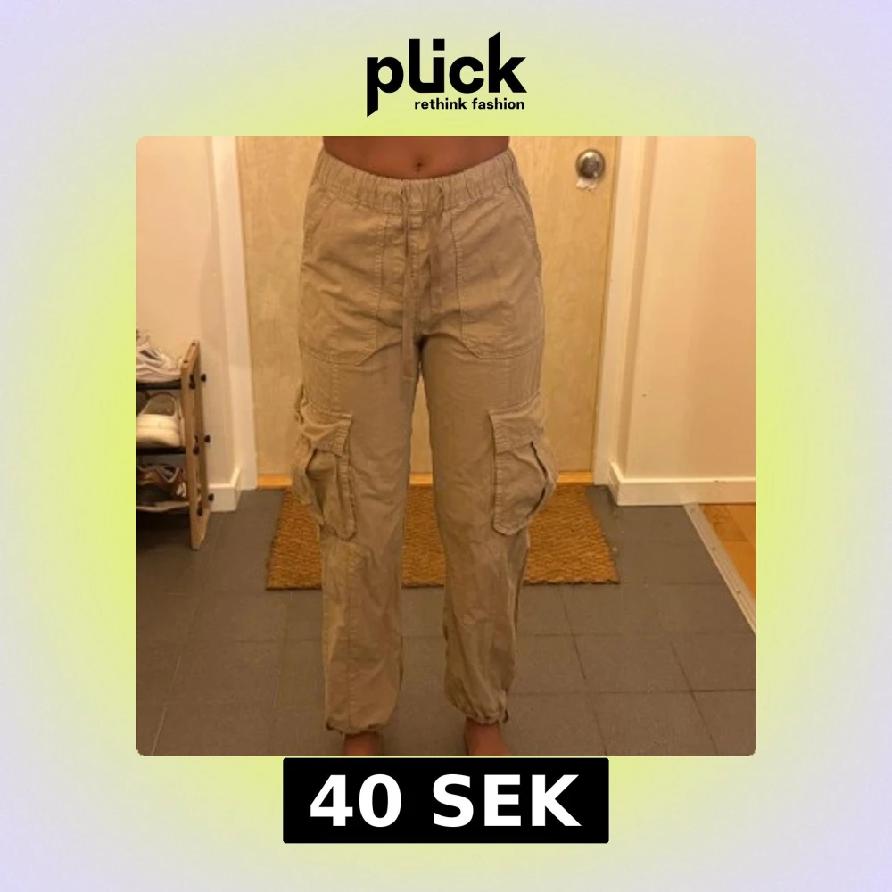 Säljer ett par beiga cargopants med elastisk midja och snörning. Byxorna har stora fickor på sidorna och resår vid bensluten för en avslappnad vibe. Perfekta för en chill och streetig look.
