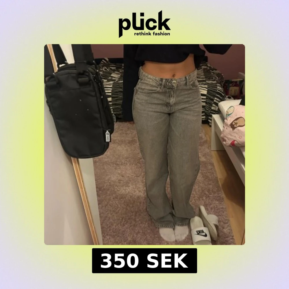 Säljer ett par gråa jeans med hög midja och raka ben. Jeansen har klassisk femficksdesign och stängs med knapp och dragkedja. Materialet är denim och passformen är relaxed med en rak siluett. Perfekta för en chill och stilren look.