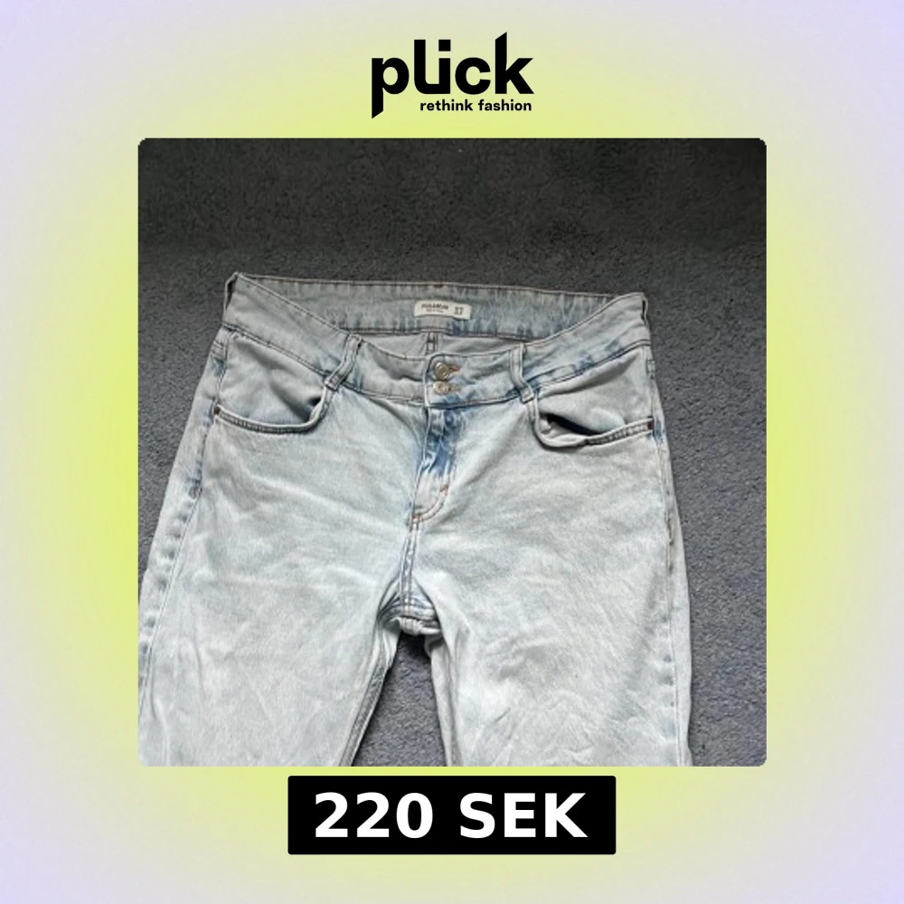 Säljer ett par ljusblå bootcut jeans från Pull&Bear. Jeansen har klassisk femficksdesign, hög midja och stängs med dubbla silverfärgade knappar. Materialet är denim i bomull och passformen är normal med utsvängda ben. Bra skick. Storlek 44, passar 42 också.