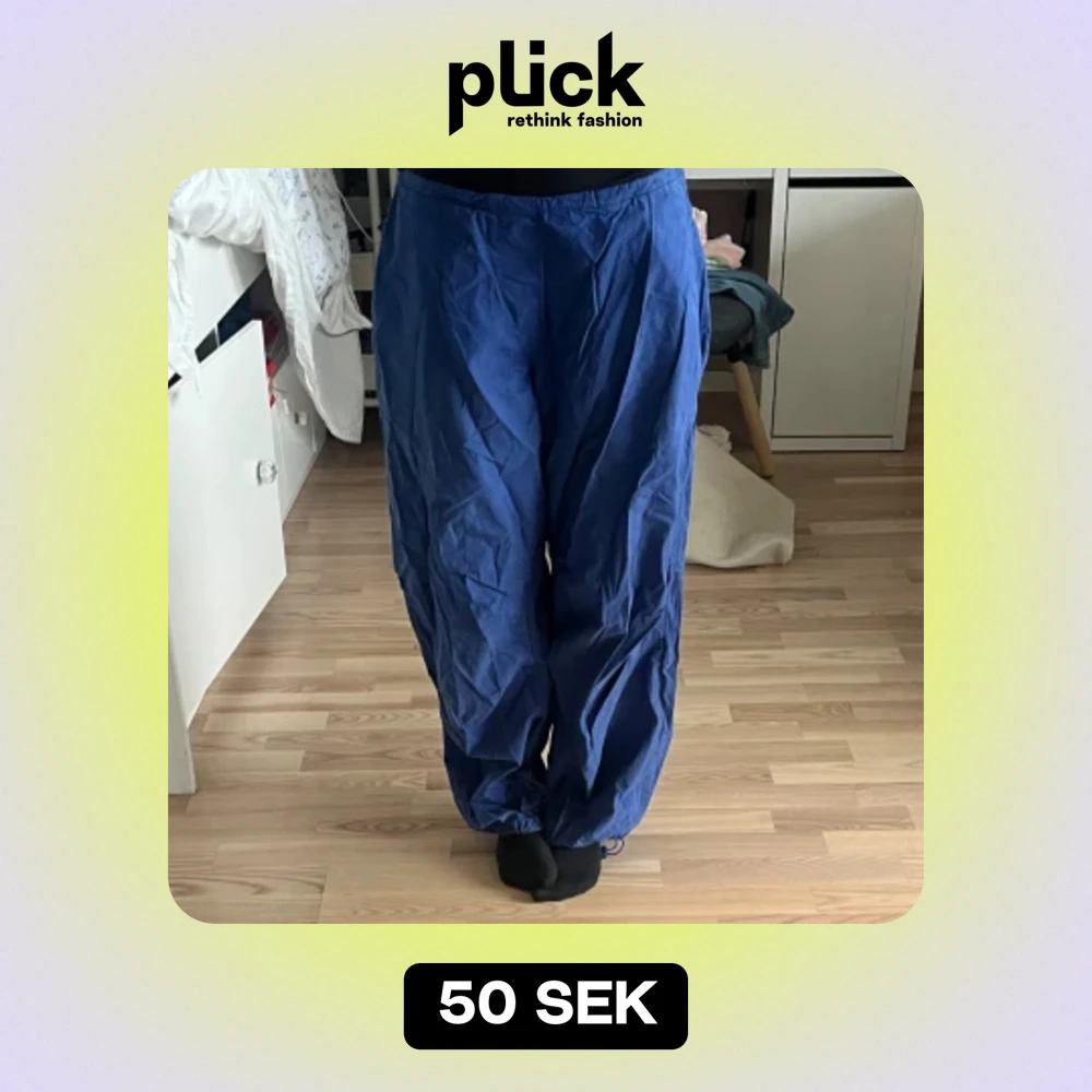 Parachute pants från pull and bear!! 💙 säljer pga jag inte använder längre. Byxorna är skrynkliga då jag inte har strykt dem, men annars inga andra stora defekter!! Fickor på sidan och där bak! Justerbara i midjan och vid anklarna💙💙 strl M