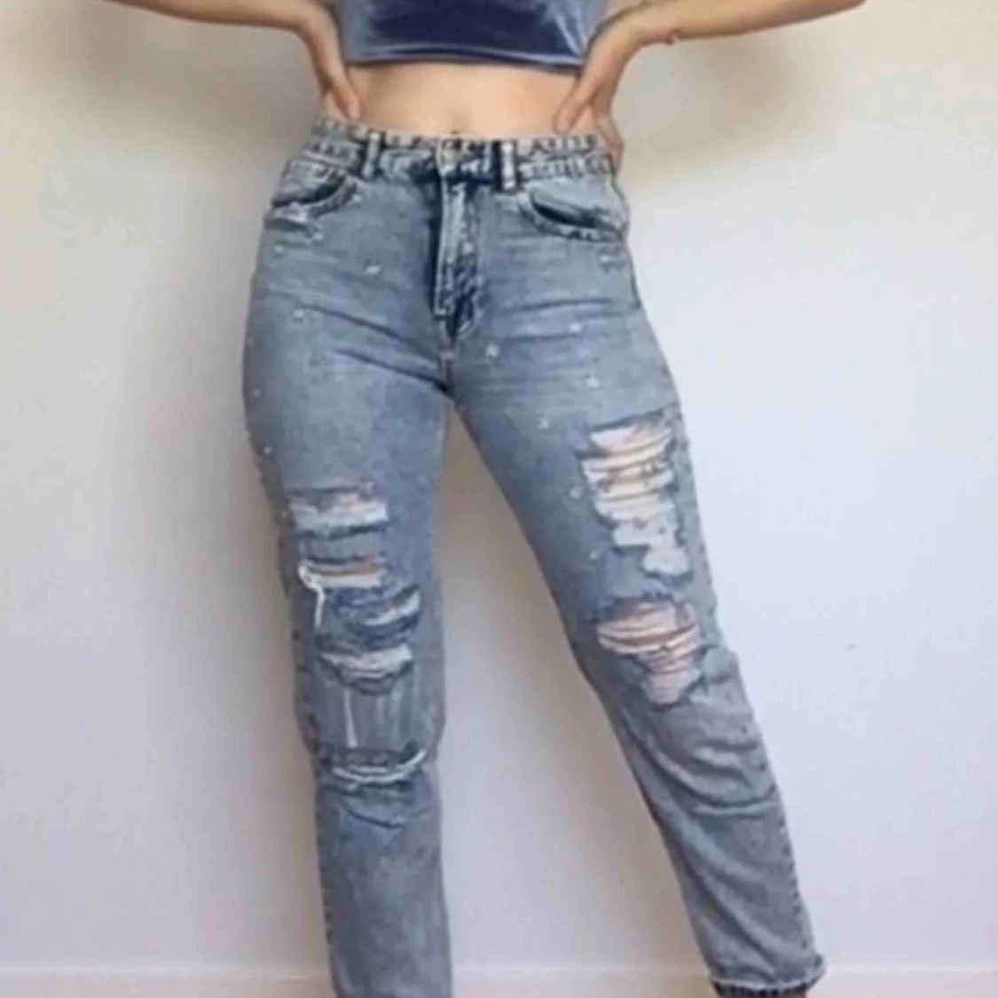 somriga momjeans med slitningar och broderade blommor. står storlek 38 men passar även 36 kanske 34. de är aldrig använda och i helt perfekt skick. fraktkostnad tillkommer 🕷