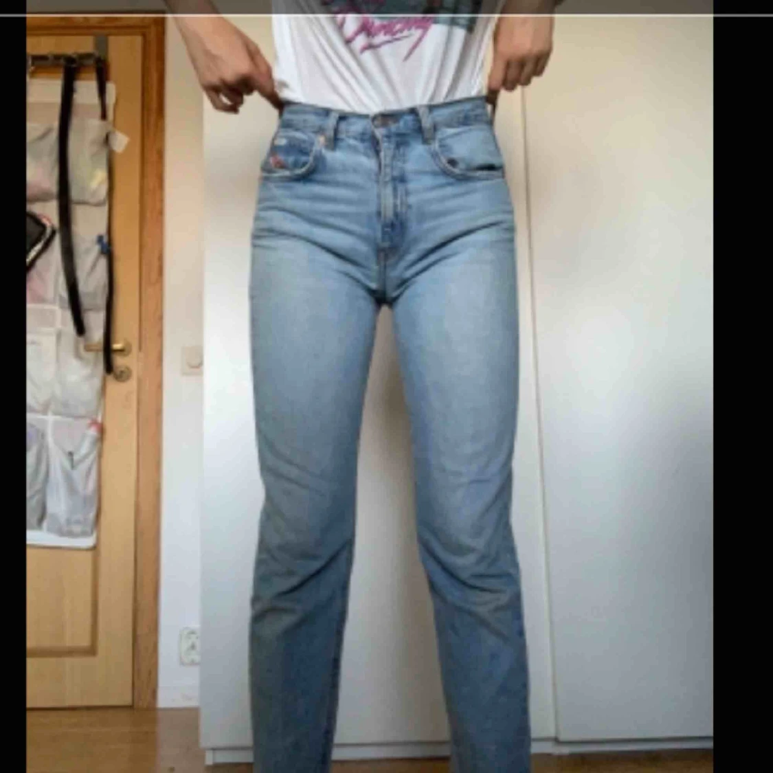 Måste tyvärr sälja mina älskade mom jeans då de blivit för små. Är i jättebra skick, förutom ett litet hål på ena bakfickan, hålet är bara ett ”lager” så fickan funkar och man ser inte igenom byxorna. Har en liten fågel vid framfickan🌸