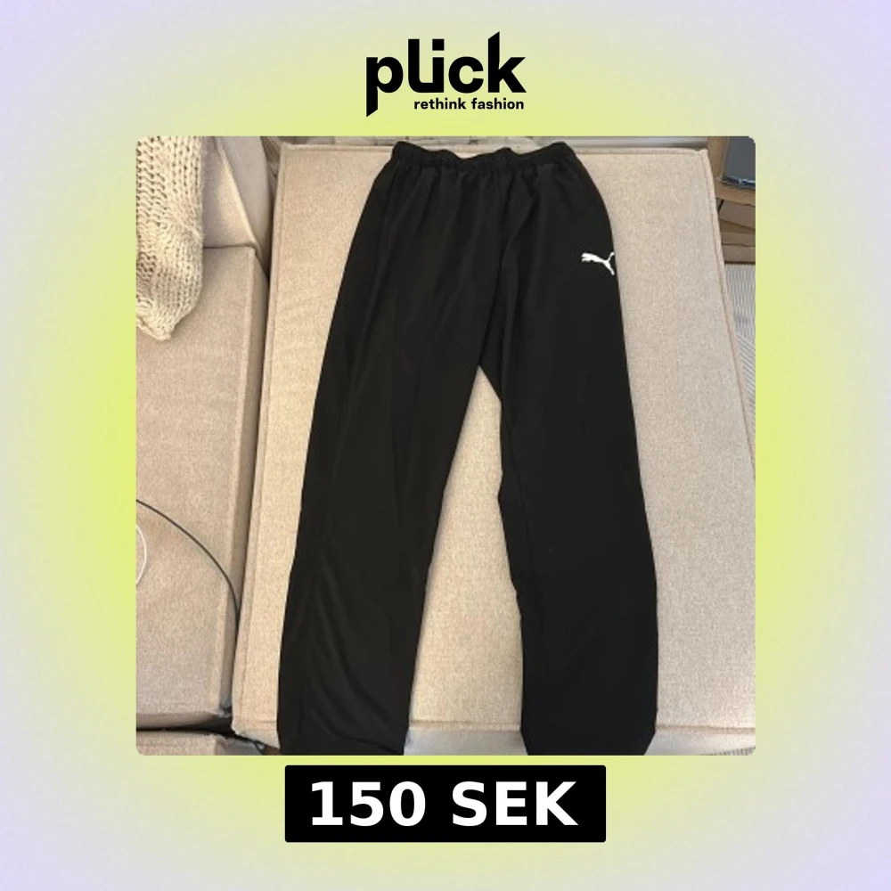 Svarta träningsbyxor från Puma med elastisk midja och klassisk vit Puma-logga på låret. Byxorna är tillverkade i ett lätt och smidigt syntetmaterial som passar perfekt för träning eller chill. Raka ben och enkel design för en clean look.