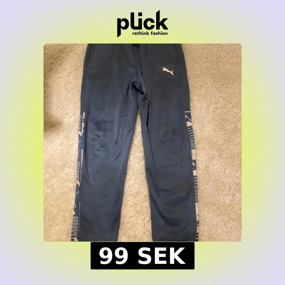 Snygga grå mjukisbyxor från Puma i storlek M. Byxorna har beige detaljer längs sidorna med grafiskt mönster och Puma-logga framtill. Tillverkade i mjuk polyester med elastisk midja och snörning för skön passform.Qr coden leder till Pumas hemsida