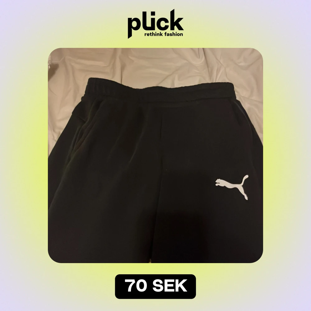 Säljer ett par svarta mjukisbyxor från Puma i storlek S. De är superbekväma och perfekta för en chill dag hemma eller en snabb tur till gymmet. Byxorna har en elastisk midja och det klassiska Puma-loggan i vitt på benet.