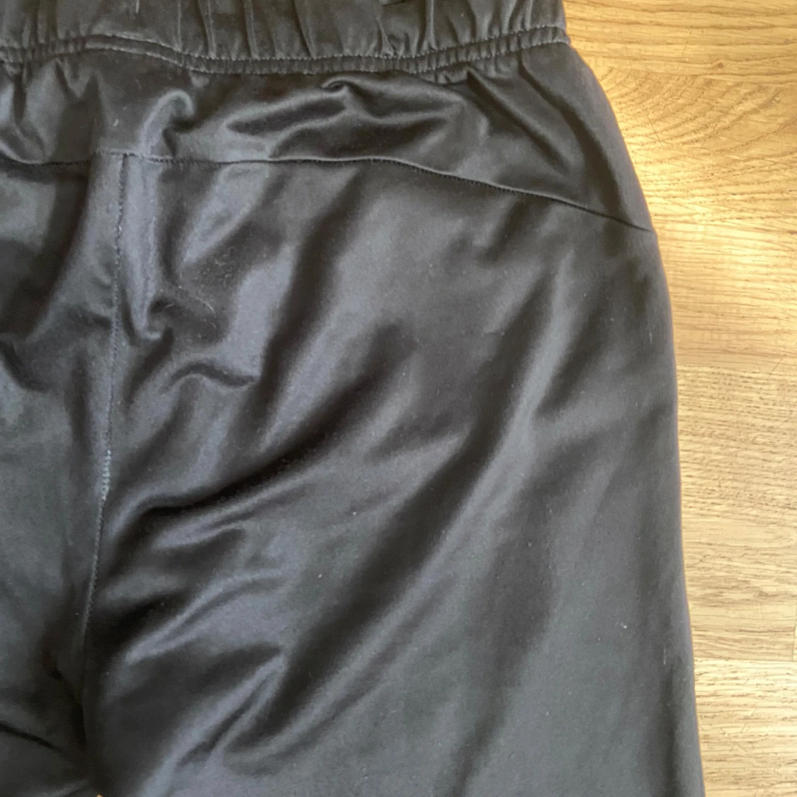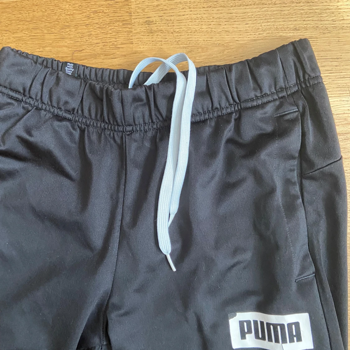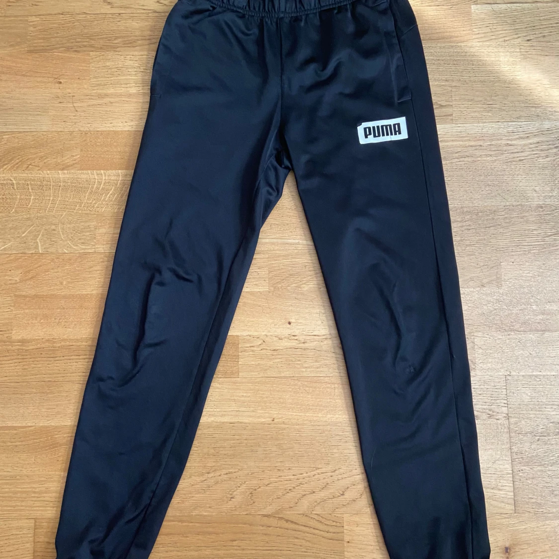 Svarta mjukisbyxor från Puma med vit logga på vänster lår. Byxorna har vit snörning och är i glansigt polyestermaterial. Okej skick-har pytterlitet hål på ett knä-syns knappt i livet och omöjligt i kamera.