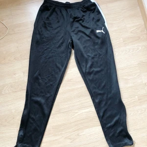 puma mjukis/träningsbyxor. vet ej storlek och storlekslappen har klippts bort, men gissar på nånstans mellan M-L för kille, och L-XL för tjej (jag är 168 cm lång, har i vanliga fall S-M och dessa är oversized /baggie men sitter bra i midjan pga resår)