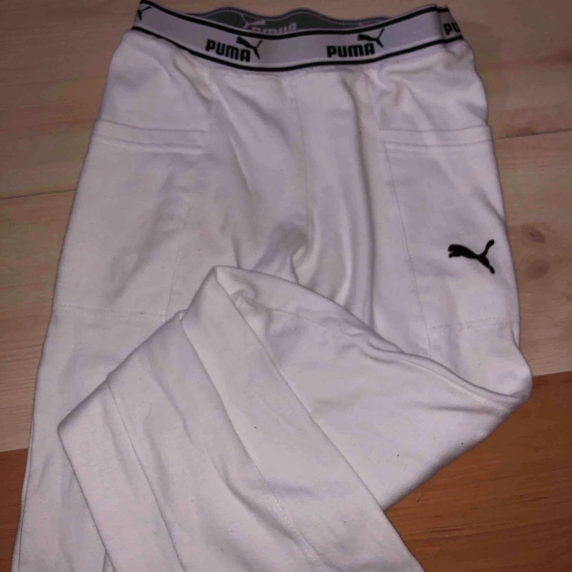 Dom är använda ett par gånger, men det syns inte. Vita utsvängda byxor från Puma.