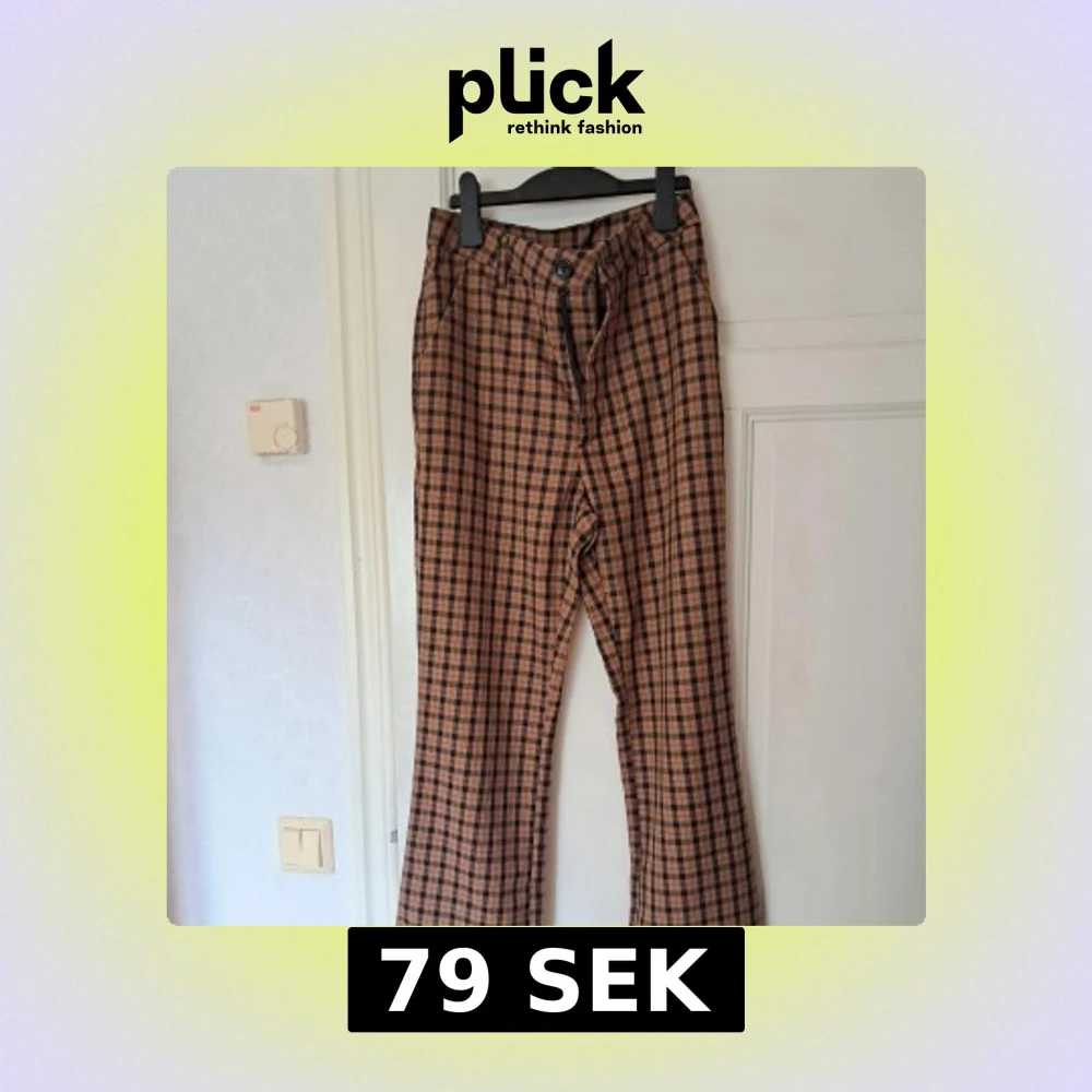 Snygga rutiga bootcut byxor från H&M i brun och svart. Vida ben och normal passform, tillverkade i mjuk polyester med lite stretch. Benen har slits nertill i sidorna se sista bilden. Perfekta för dig som gillar en rockig och alternativ look. Stängs med knapp och dragkedja framtill.