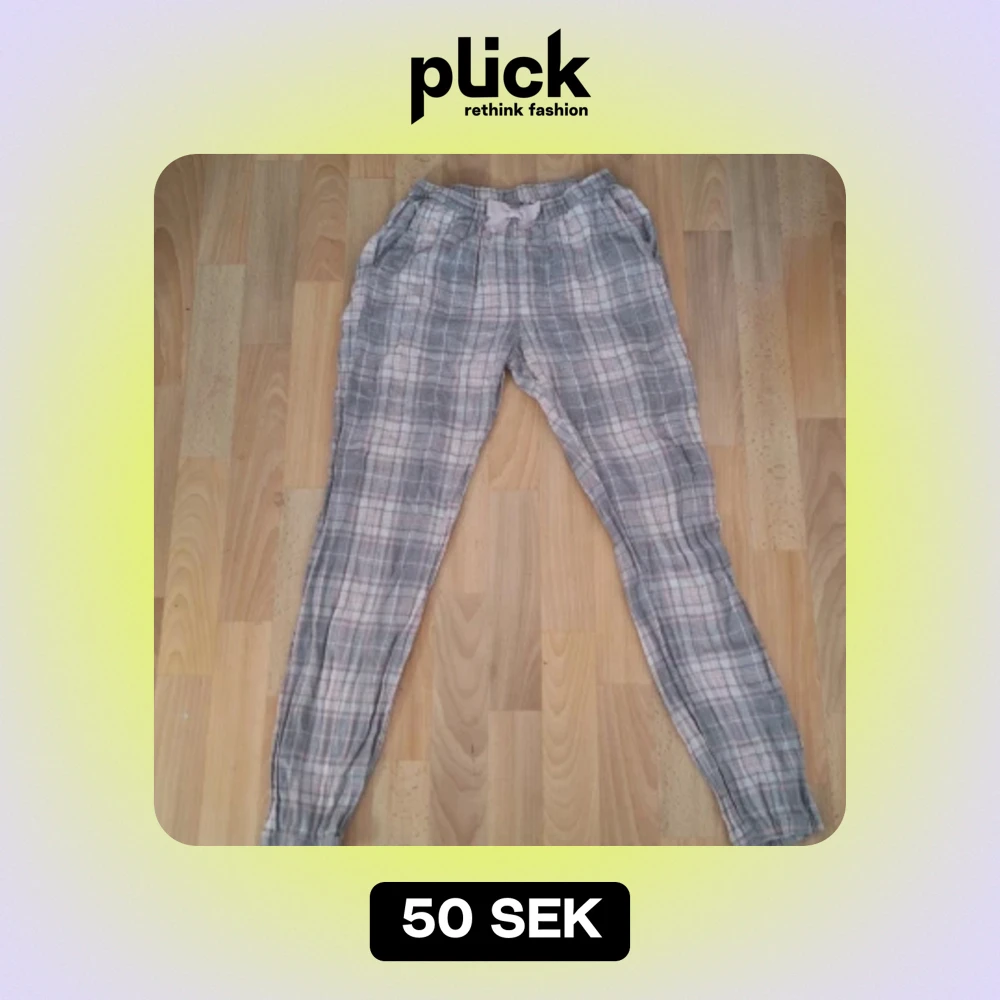 Grå, rosa, vit rutiga Pyjamasbyxor i storlek 164 (för barn), men dom passar mig som har xs-s, jag är 1,59cm o dom passar i längden. Dom har en rosett framtill, helt okej skick dock skrynkliga då jag inte orkat strycka dom 🙈