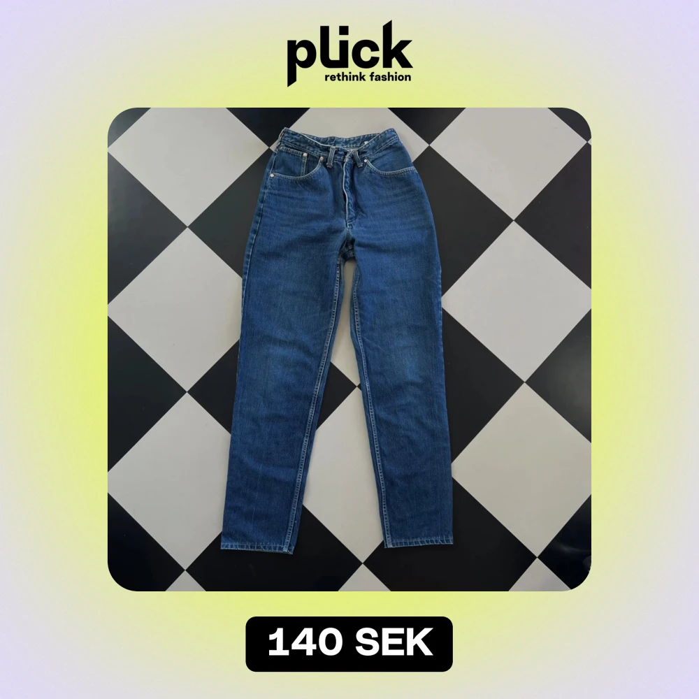 Märkesjeans med hög midja och raka ben. Innerbenlängd 76 cm. Yttre från midja till benslut 106 cm. Passar gissningsvis extrasmall och small, w25,26. 100% bomull/denim.