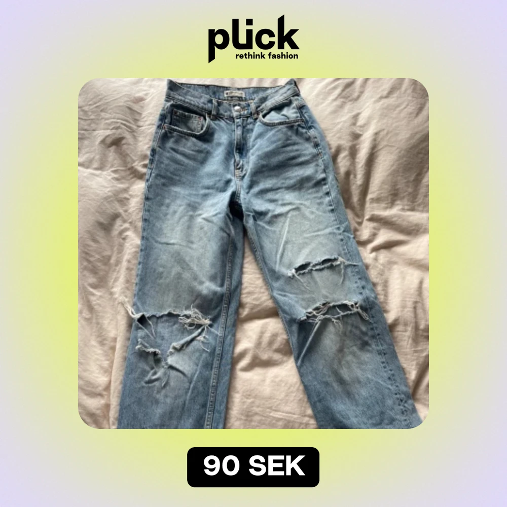 Blåa raka jeans med hål, använda men är i bra skick. Strl 34 och säljes för 90kr