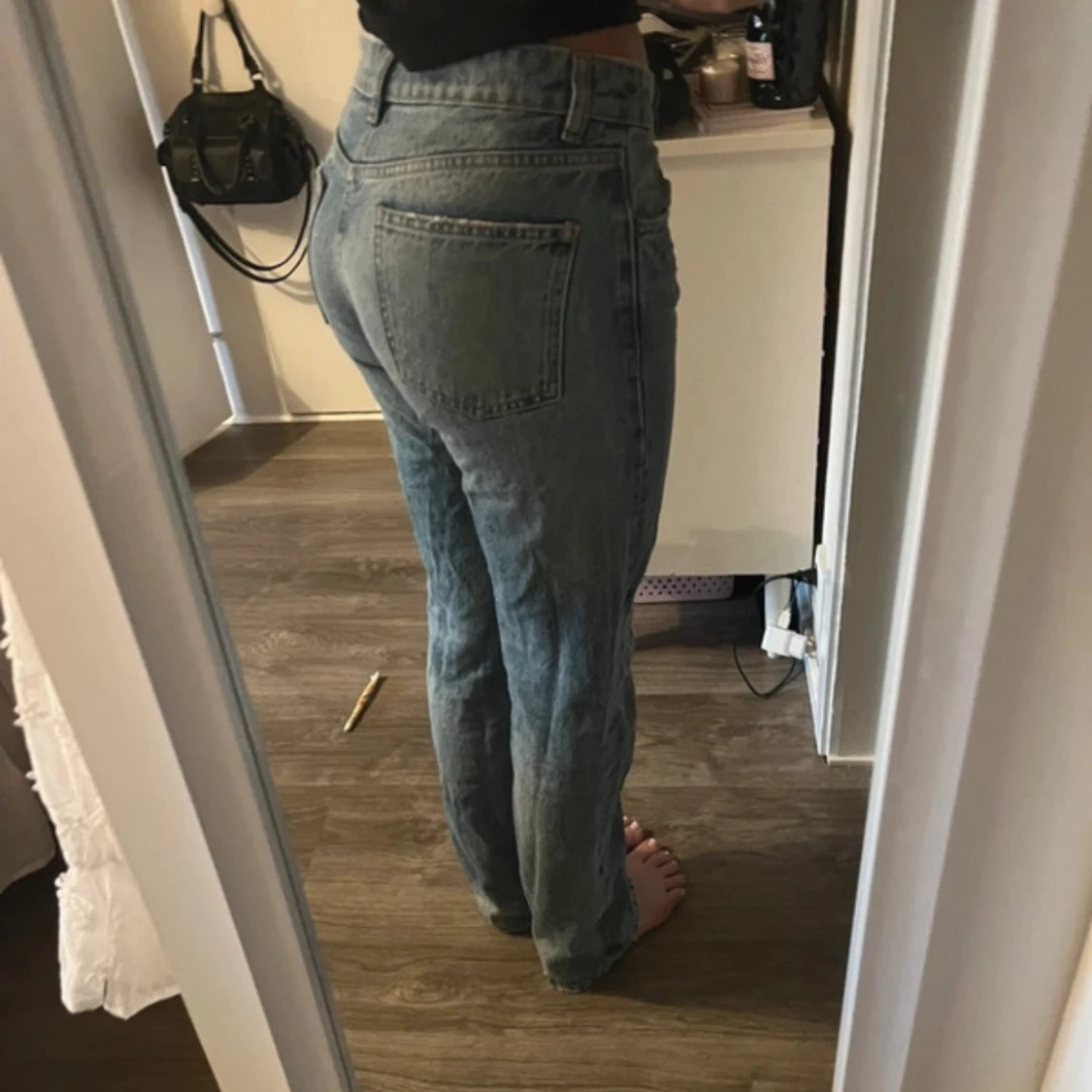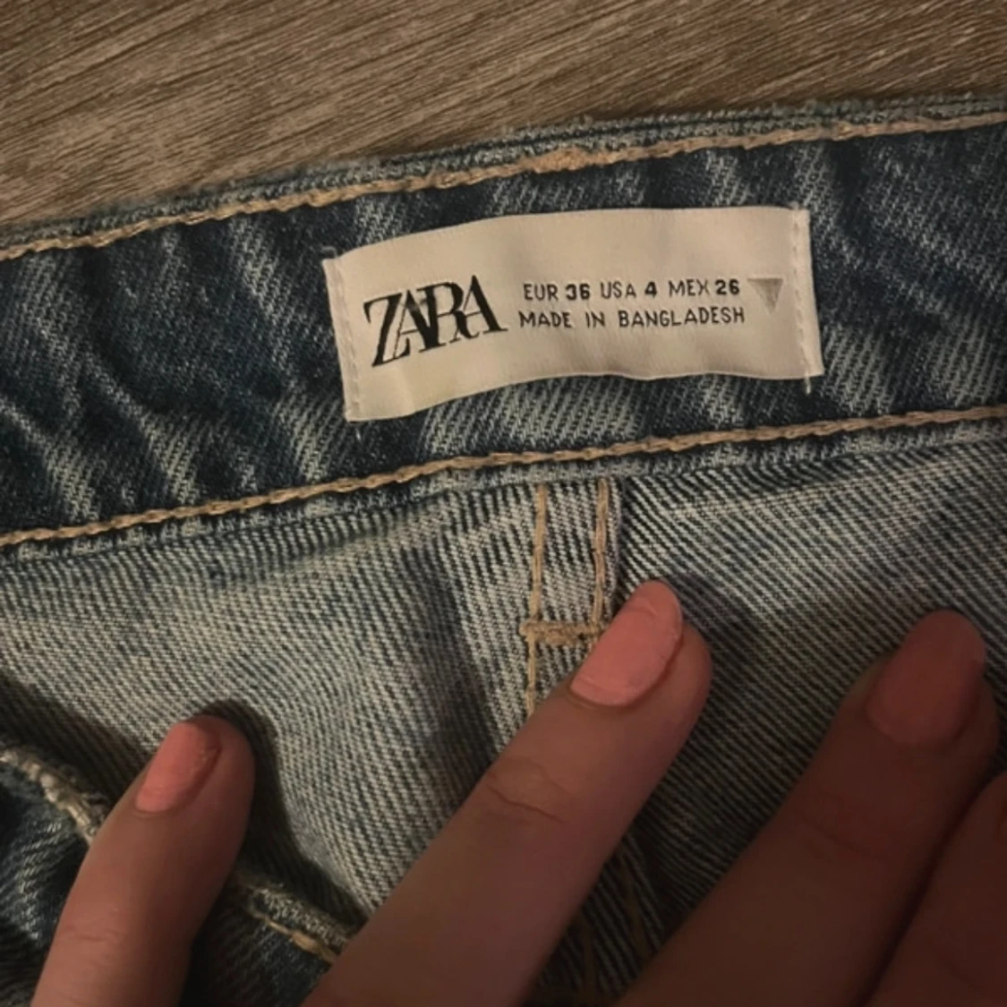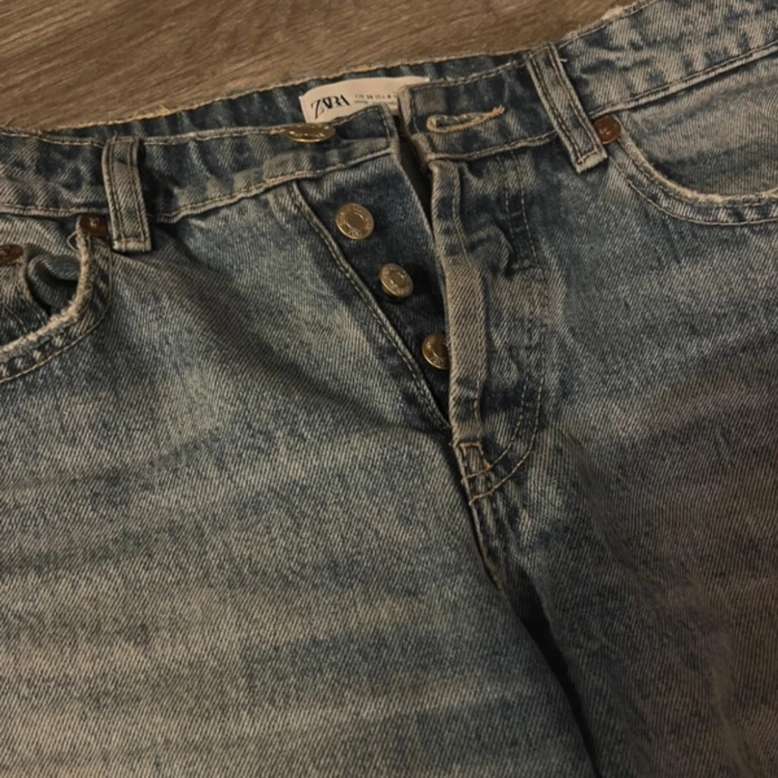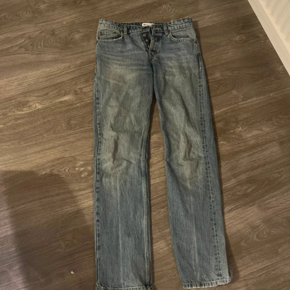 Säljer ett par klassiska blå jeans från Zara. De har en mellan- låg midja och raka ben med knappar framtill.
